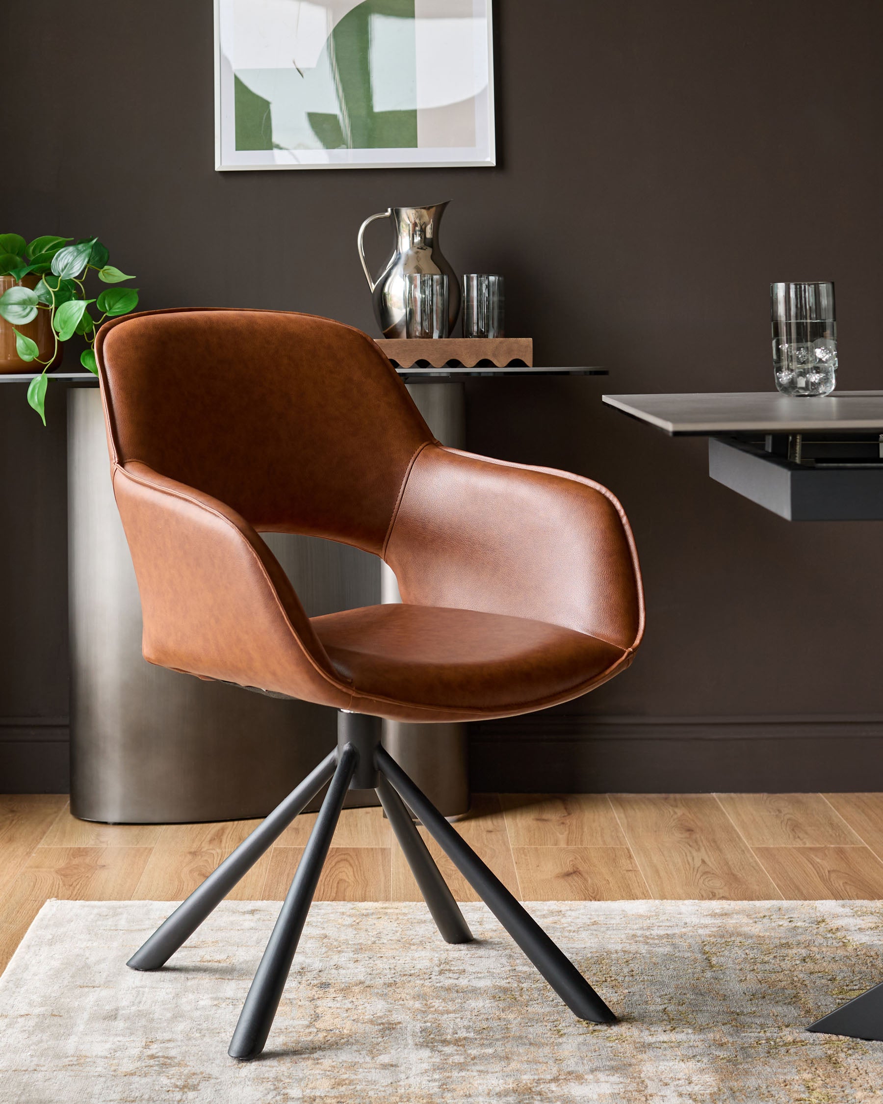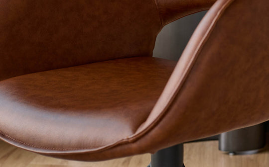 The Marlow tan faux leather swivel dining armchair brings sophisticated comfort to every gathering. With its luxuriously soft Durosoft faux leather, cushioned seat and smooth 360-degree swivel, this contemporary armchair invites lingering conversations around your table. The gently curved backrest and integrated armrests create an inviting silhouette that works beautifully in both casual breakfast nooks and formal dining spaces.