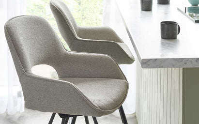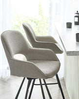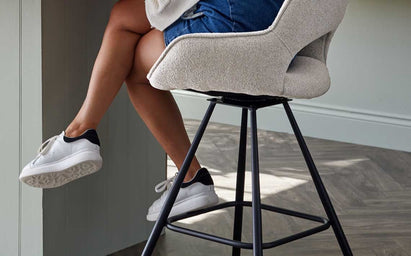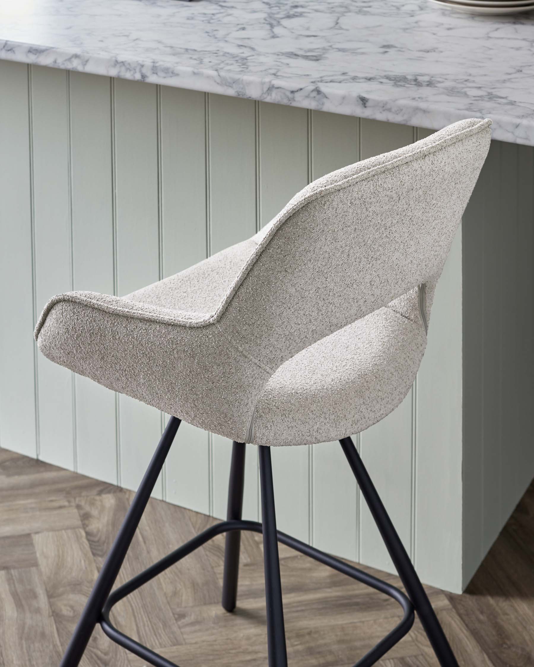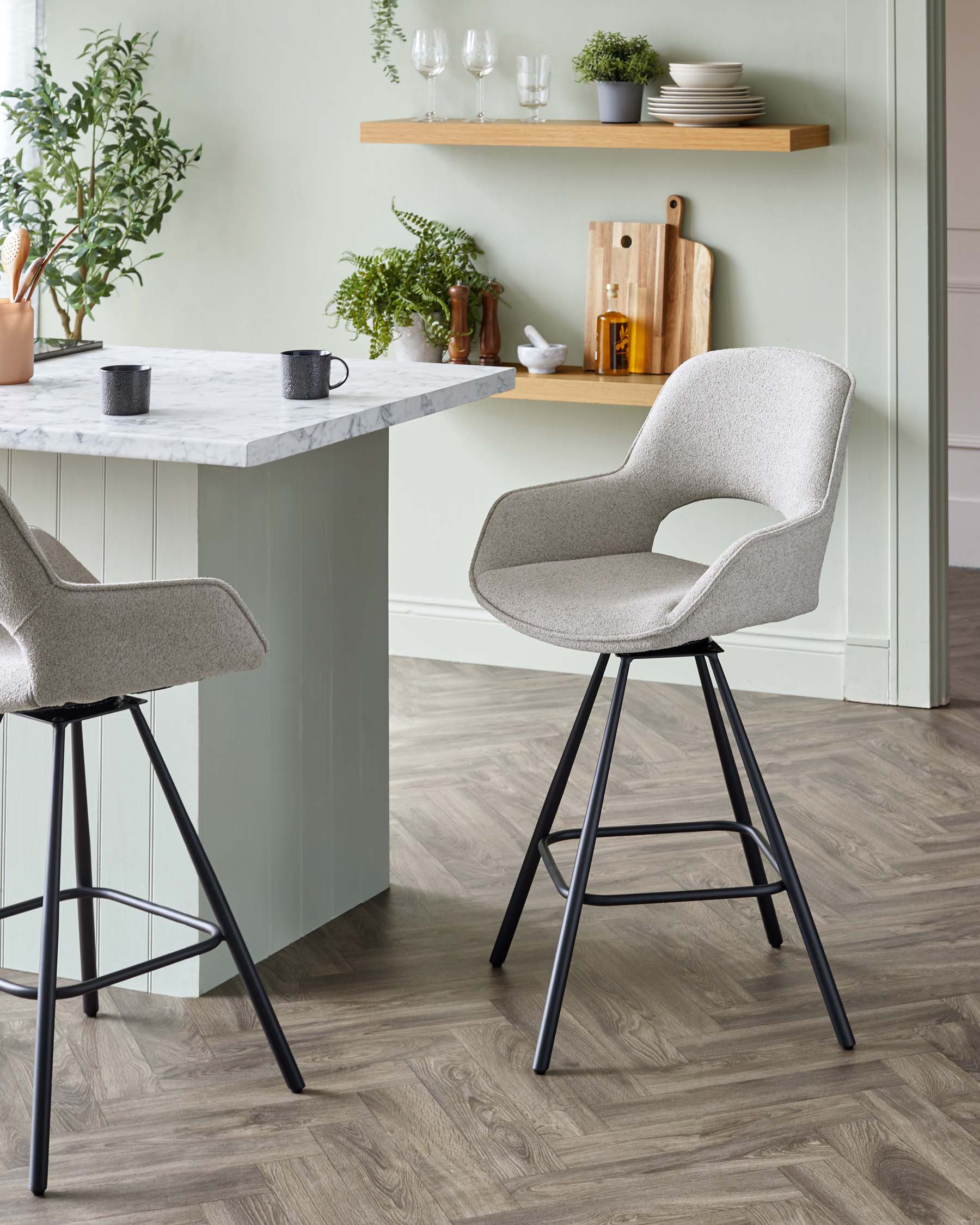 The Marlow swivel bar stool brings comfort and contemporary style to your kitchen island or breakfast bar. With its soft light grey boucle upholstery and sleek black metal frame, this fixed-height stool offers cushioned support for morning coffee or evening conversations. The 360-degree swivel base makes it perfect for socialising, letting you turn effortlessly between kitchen and living spaces.
