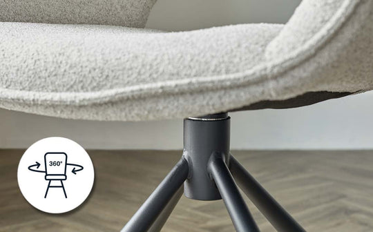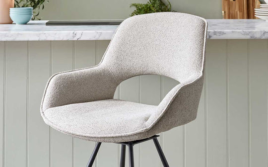 The Marlow swivel bar stool brings comfort and contemporary style to your kitchen island or breakfast bar. With its soft light grey boucle upholstery and sleek black metal frame, this fixed-height stool offers cushioned support for morning coffee or evening conversations. The 360-degree swivel base makes it perfect for socialising, letting you turn effortlessly between kitchen and living spaces.