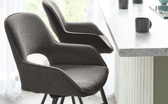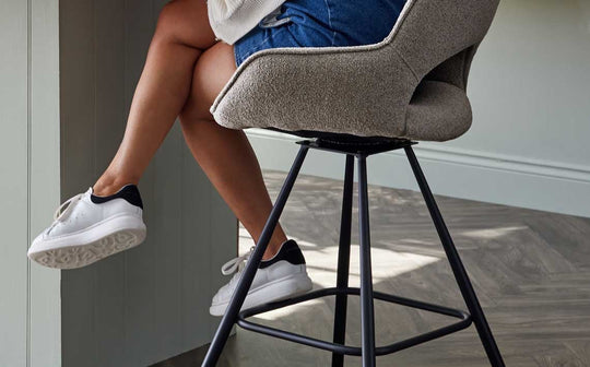 The Marlow swivel bar stool brings sophisticated comfort to your kitchen counter or breakfast bar. Wrapped in soft, textured warm grey boucle fabric, this fixed-height stool features a generously padded seat and backrest for relaxed dining. The 360-degree swivel base on sleek black metal legs makes conversation flow as easily as morning coffee, while neat piping details add refined finishing touches.