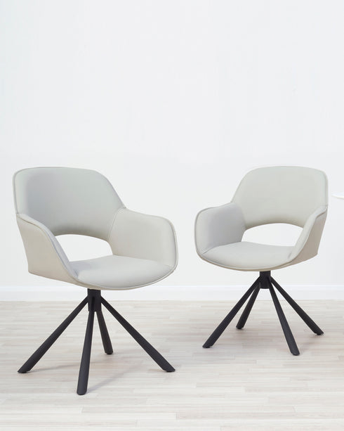 The Marlow warm grey boucle swivel dining chair brings comfort and style to every meal. Upholstered in luxuriously soft boucle fabric with neat piping detail, this chair features a gently curved silhouette that cradles you while the 360-degree swivel base lets you turn effortlessly between conversations. Sold in pairs, these versatile chairs work beautifully with glass, wood or metal dining tables.