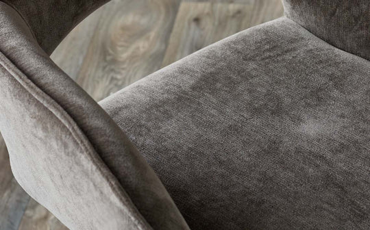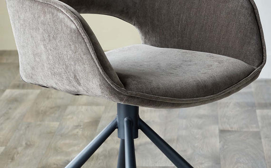 The Marlow mocha fabric swivel dining chair brings together comfort and contemporary style in one smart package. Upholstered in soft chenille fabric with a warm mocha tone, this chair features generous padding and a 360-degree swivel base that makes conversation flow as easily as the wine. Perfect for long dinners and lazy Sunday brunches alike.