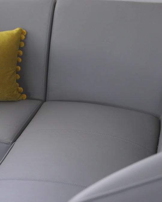 The Mellow 5-seater right-hand corner bench offers a modern and practical dining solution for busy homes. Upholstered in premium faux leather, its sleek silhouette is complemented by the brushed stainless steel tapered legs, adding a touch of understated elegance. The spacious design comfortably seats five, making it perfect for family meals or casual gatherings with friends. Durable and easy to care for, the faux leather upholstery is designed to withstand everyday use. The high backrest and cushioned seats offer exceptional comfort, while the zig-zag springs provide lasting support and prevent sagging. Adjustable floor protectors ensure stability and prevent damage to your flooring. Style the Mellow corner bench with a coordinating dining table and additional dining chairs to complete your dining space. Scatter cushions can be added for extra comfort and a pop of colour or texture.Details