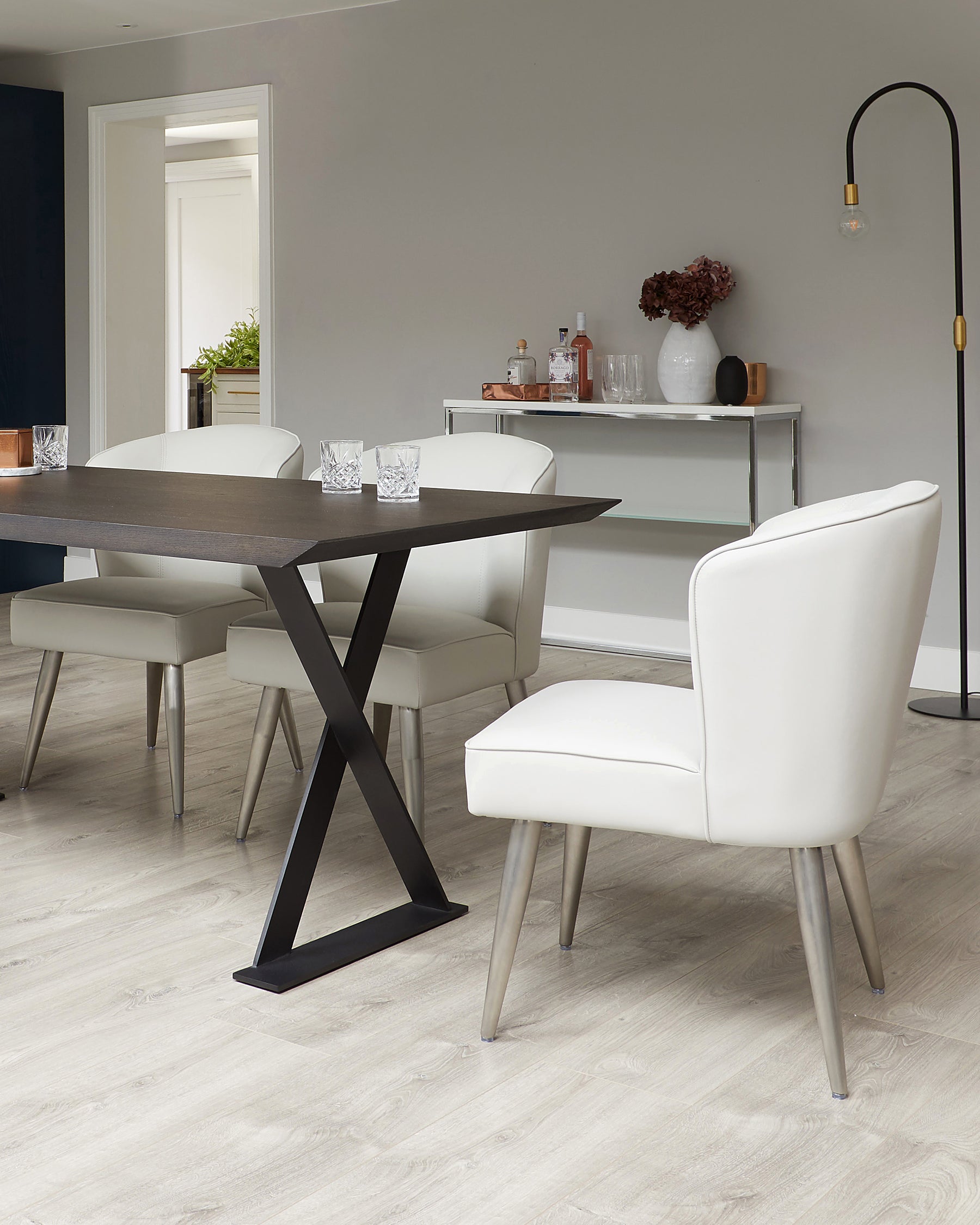 Inspired by our popular Mellow dining benches, the Mellow dining chair makes a stylish addition to any dining space. Generously sized with a wide, thick seat and comfy padded back, this faux leather chair offers exceptional comfort. The light grey durosoft faux leather upholstery adds a touch of understated elegance, while the sleek stainless steel legs create a contemporary feel. Durable and resilient, the Mellow dining chair features sag-resistant zig-zag springs and adjustable floor protectors for added practicality. Style with a modern dining table, whether a sleek minimalist design or a more rustic, textured style, and the matching Mellow dining bench for a cohesive and inviting dining area.Details