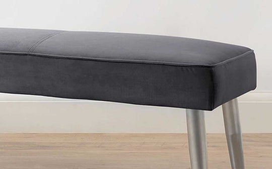 The Mellow dark grey velvet 3 seater bench brings sophisticated seating to dining spaces, hallways or bedrooms. Its backless design fits seamlessly beneath tables or against walls, while plush velvet upholstery and high-density foam cushioning ensure comfort for three. Supported by sleek stainless-steel legs with adjustable floor protectors, this versatile piece works beautifully wherever extra seating is needed.