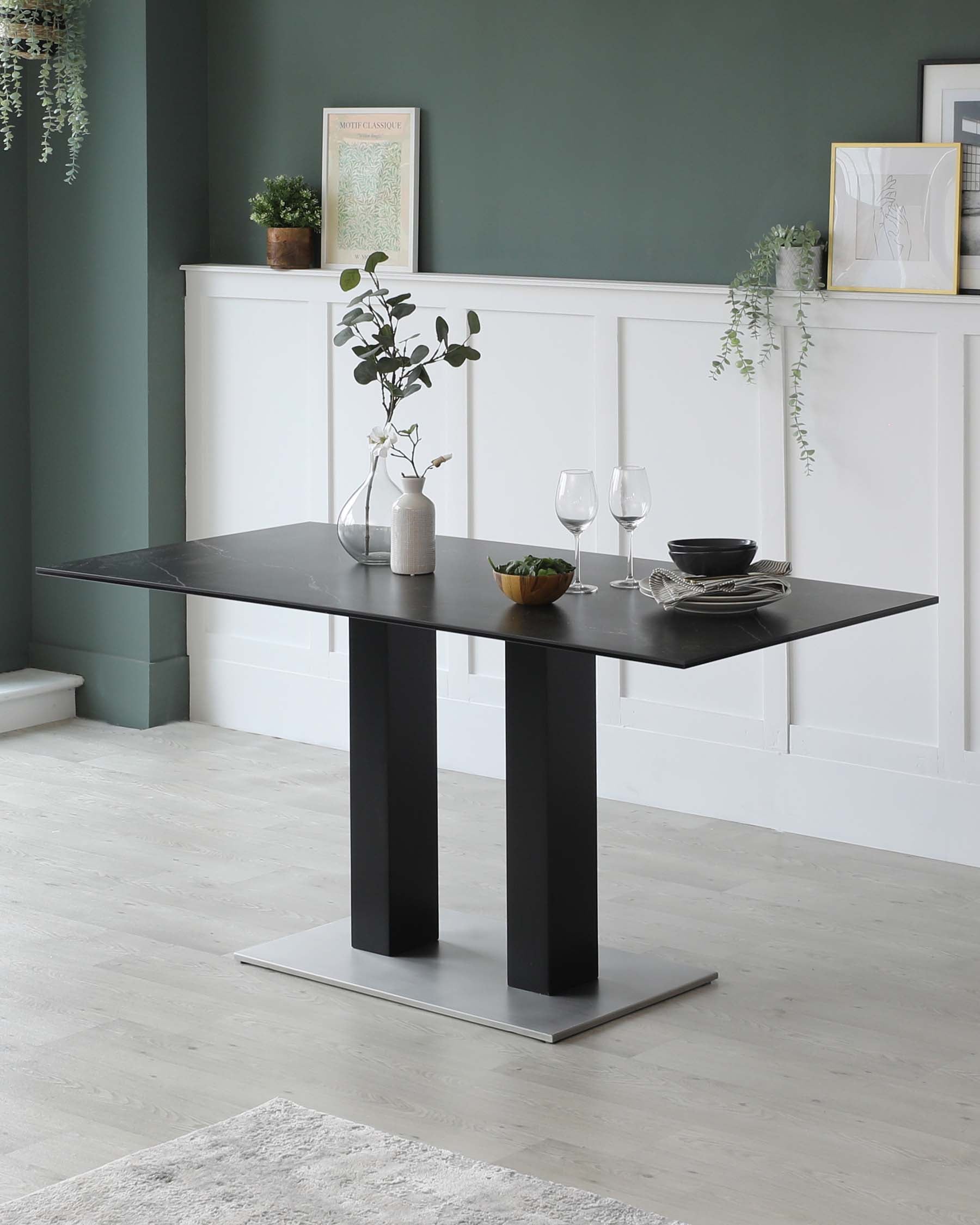 The Mia black ceramic dining table brings contemporary sophistication to mealtimes with its sleek pedestal base and scratch-resistant ceramic top. Comfortably seating 6, this striking table handles everything from hot dishes straight from the oven to dinner parties that run late. The spacious rectangular design and brushed stainless-steel accents create a centrepiece worthy of your best moments.