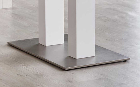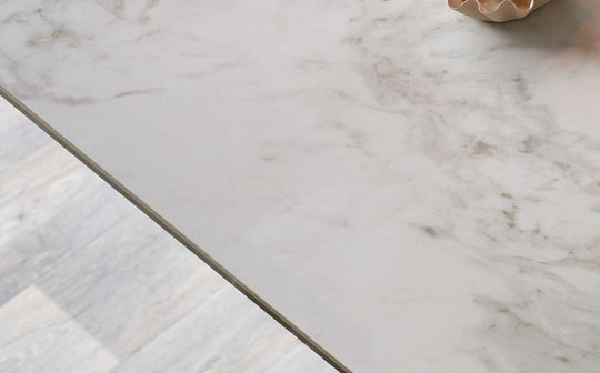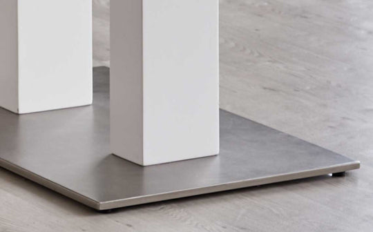 Create the heart of your home with the Mia dining table, where white marbled ceramic meets brushed stainless steel in perfect harmony. This 6-seater combines the luxurious look of marble with the practicality modern life demands - spill-resistant, scratch-proof, and ready for everything from rushed breakfasts to lingering dinner parties. The striking double pedestal base provides stability while keeping legroom generous.
