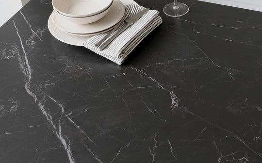 The Mia 6 seater table and 6 Kendra dining chairs set brings sophisticated dining to your home. The striking black ceramic table top sits on a sculptural pedestal base, offering generous space for 6 guests without the clutter of traditional legs. Paired with plush champagne velvet Kendra chairs featuring elegant vertical slat backs, this set creates the perfect setting for memorable meals.