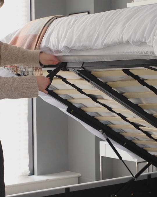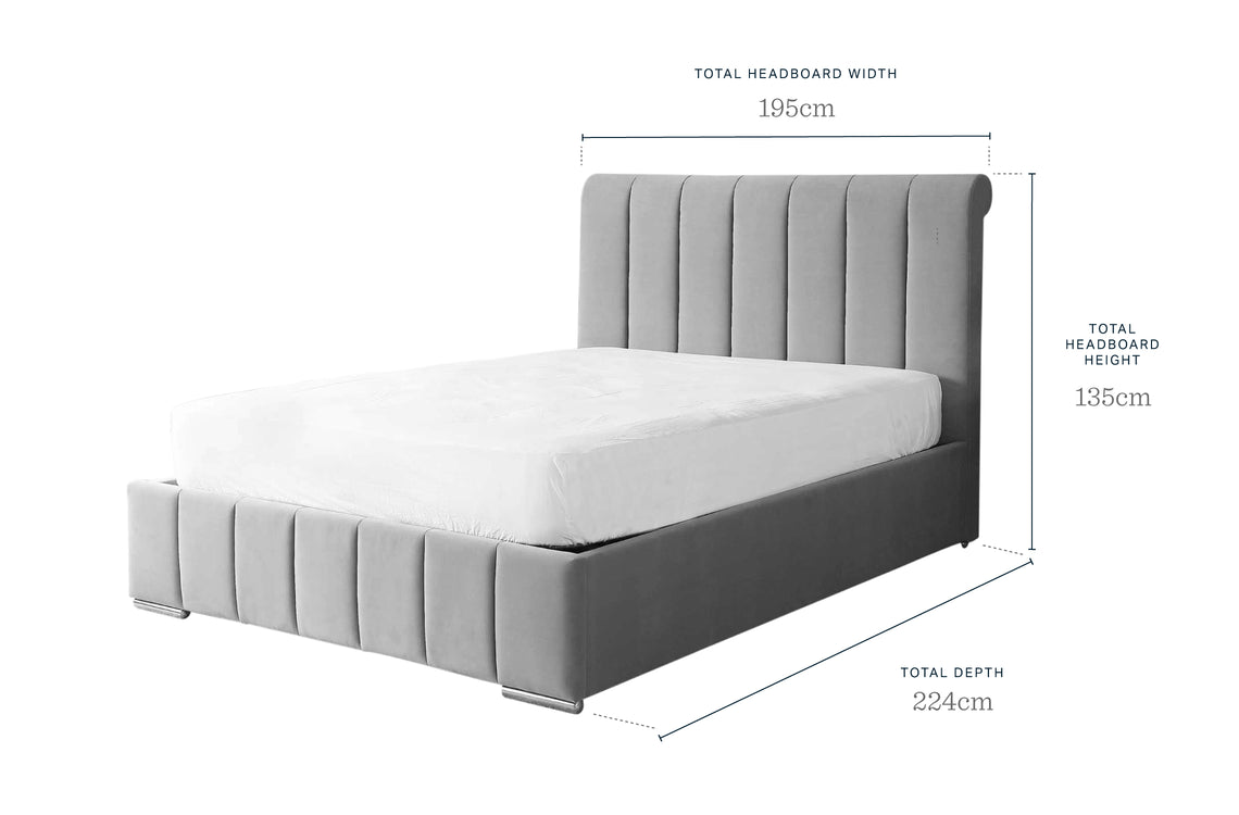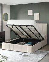 Contemporary and comfortable, the Mila cream fabric super king size ottoman storage bed is a stylish addition to any bedroom. Upholstered in a high-quality cream fabric, its eye-catching fluted headboard creates a striking focal point. This luxurious bed frame offers generous hidden storage, easily accessible thanks to durable hydraulic pistons and hardboard base. The sprung slats and webbing provide enhanced comfort and support for a restful night's sleep. Style the Mila with crisp white or neutral bedding and throws for a sophisticated look. Add scatter cushions and throws in complementary colours for a touch of personality. Complete the look with simple bedside tables and soft lighting to create a calming and inviting atmosphere. Pair with one of our luxurious mattresses for the ultimate sleep experience.Details