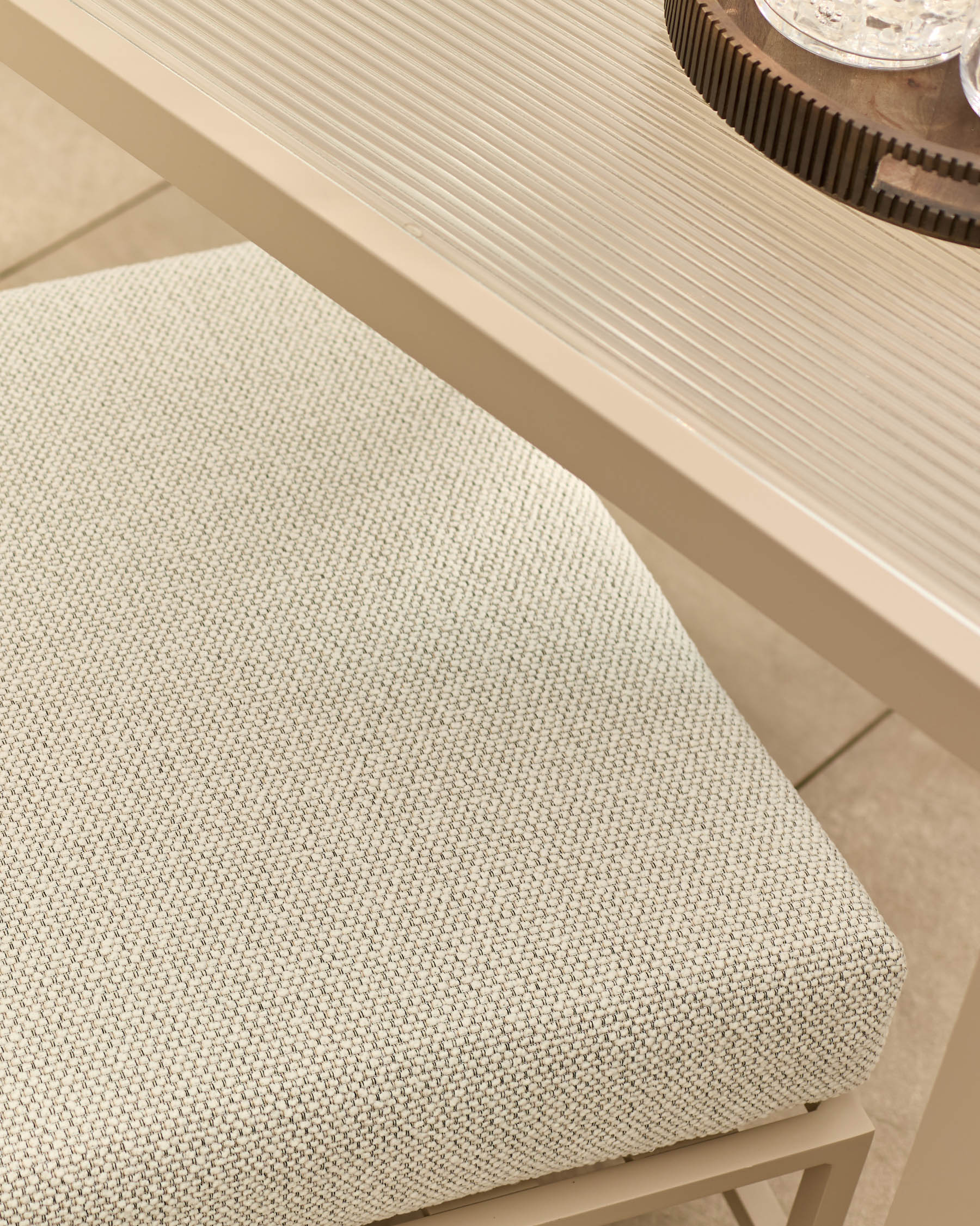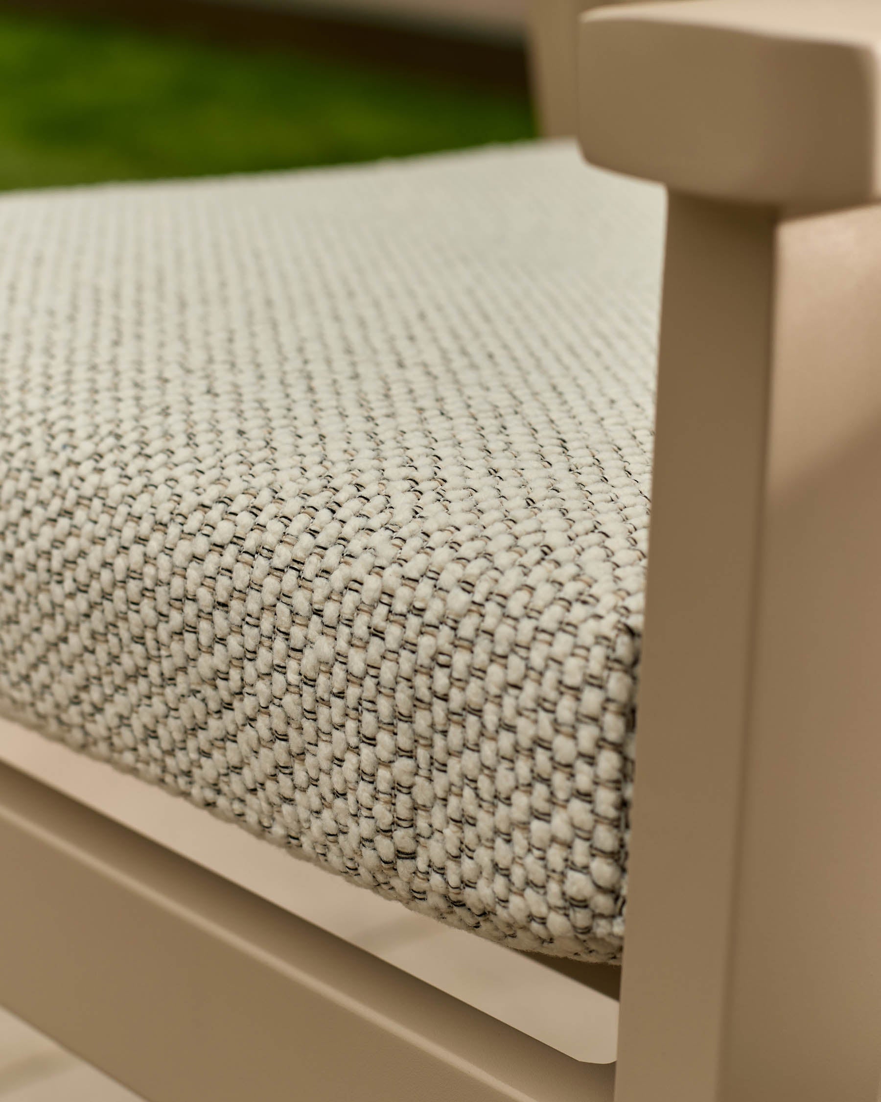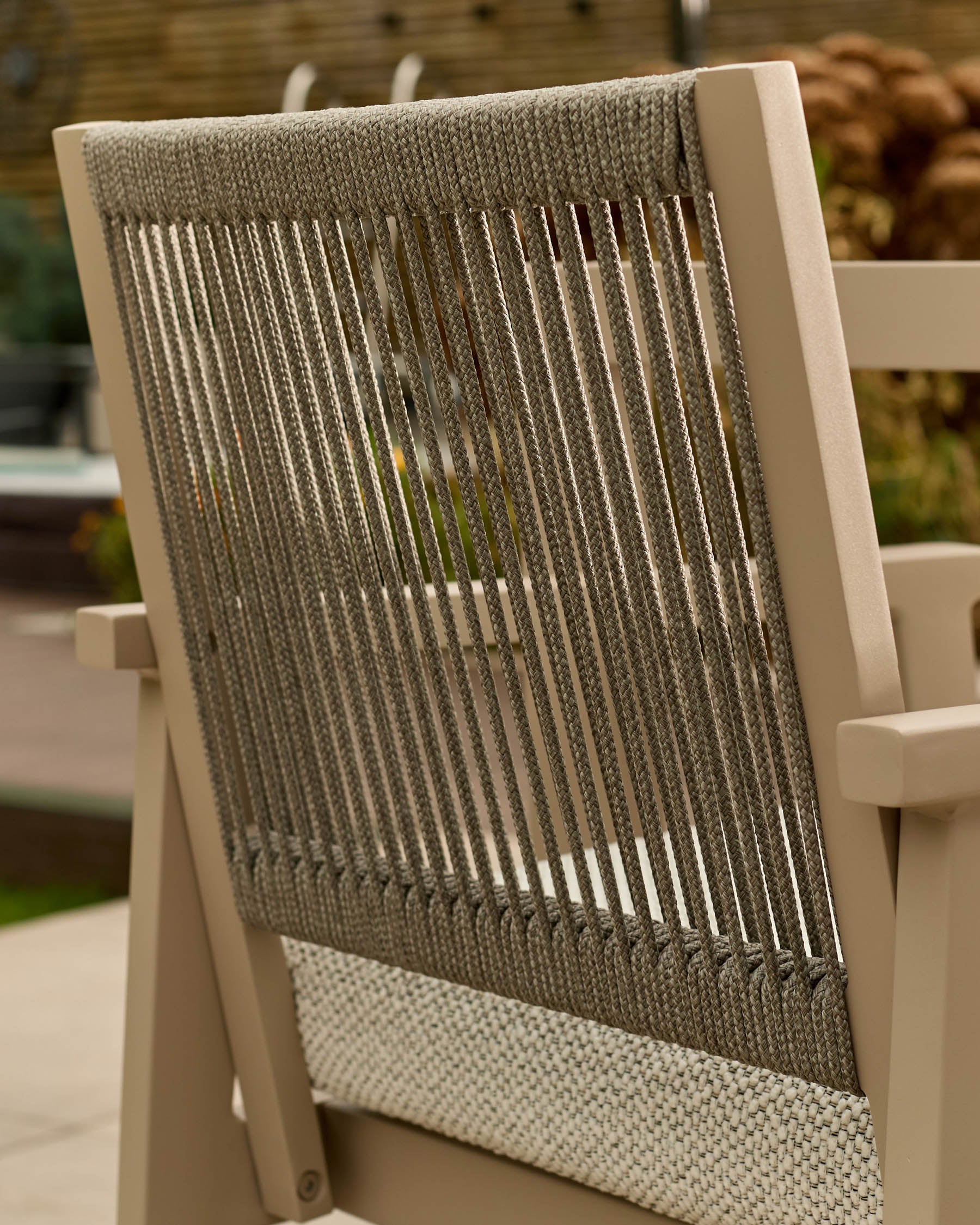 - Outdoor-resistant natural chunky weave on chairs and bench