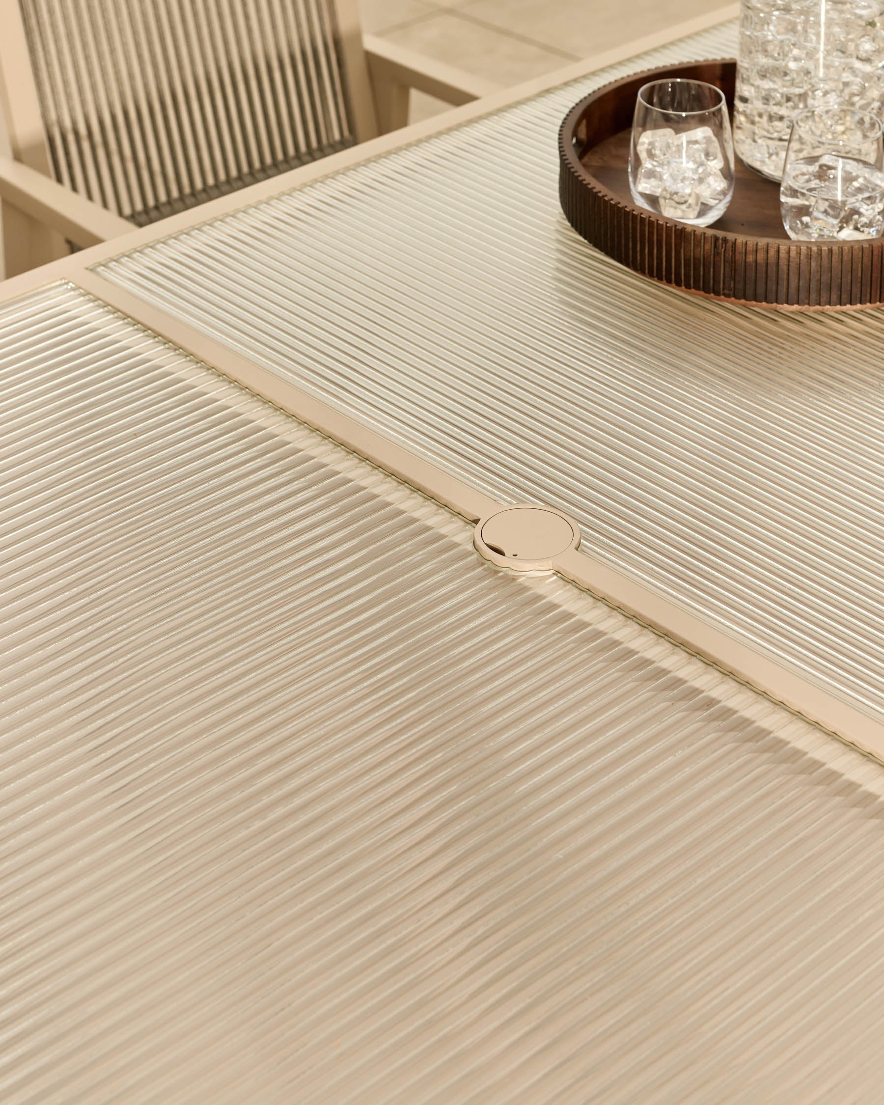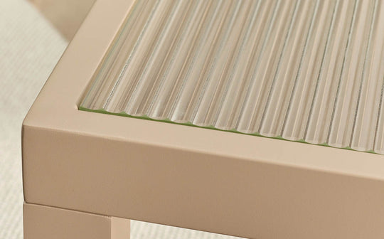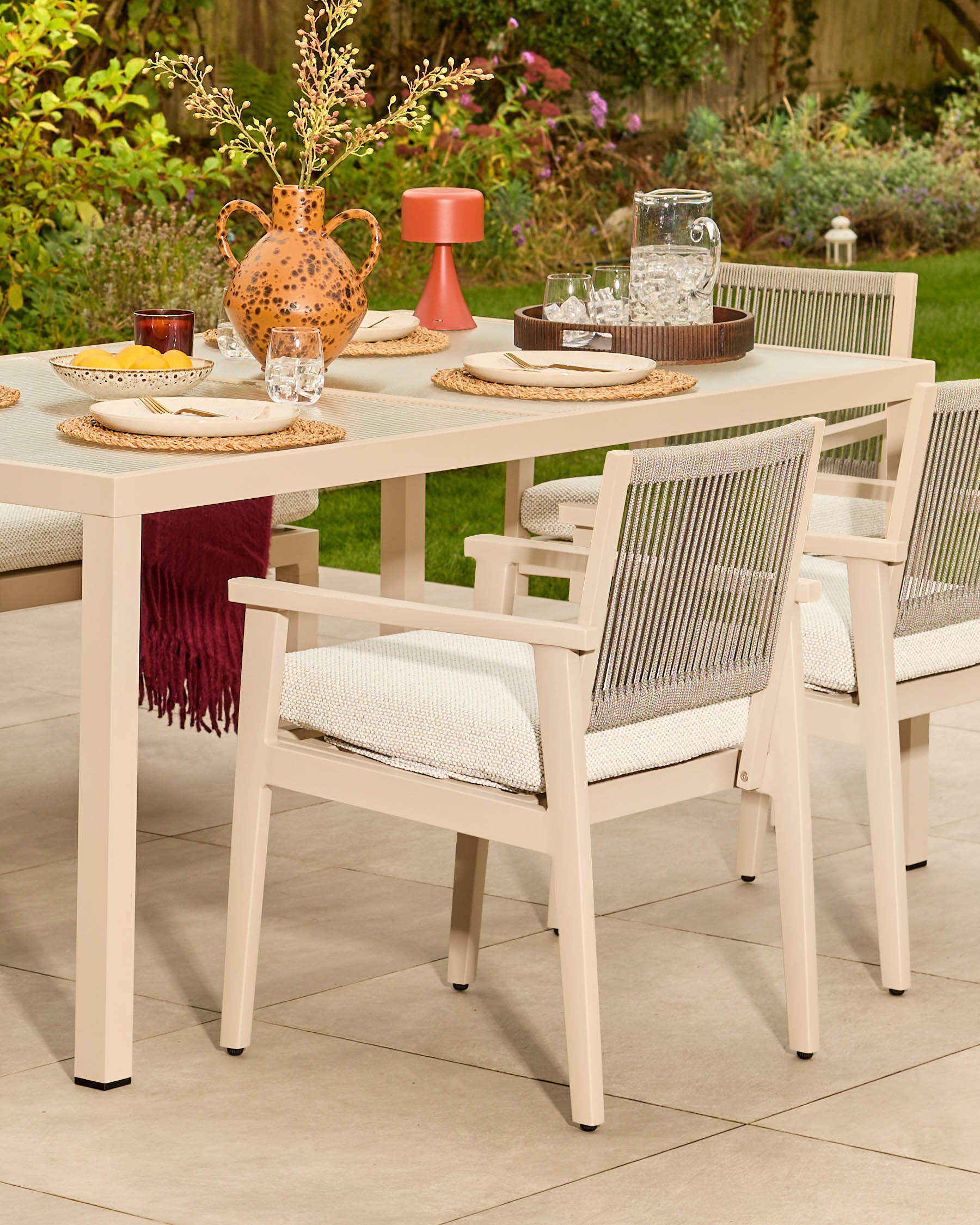The Minori natural garden dining set brings sophisticated outdoor dining to your space with its thoughtful blend of textures and tones. This six-seater set features a stunning reeded glass table top that catches the light beautifully, paired with 4 armchairs and a 3-seater bench in natural chunky weave. Built to withstand the seasons whilst maintaining its refined aesthetic.