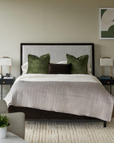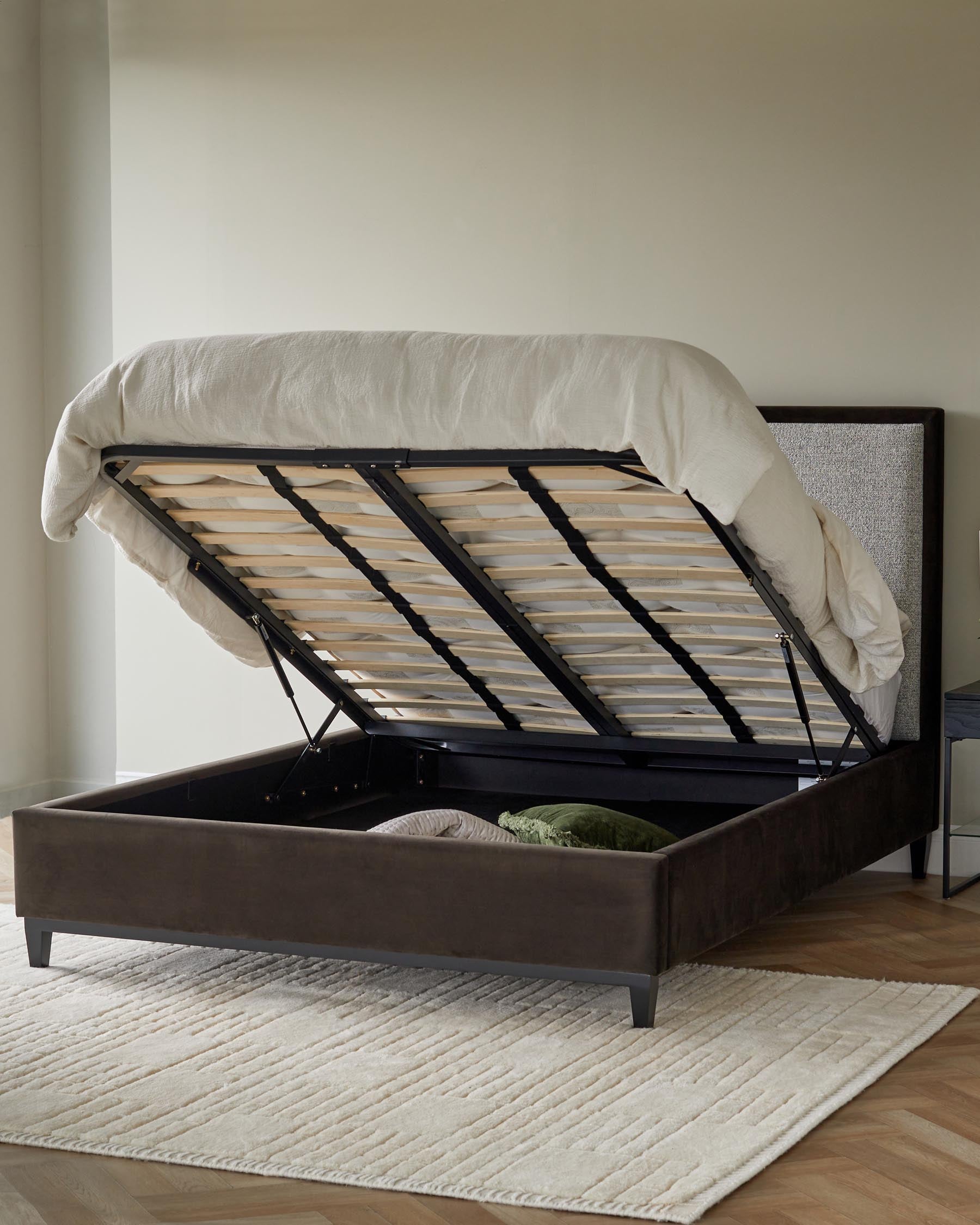 The Monica king size ottoman storage bed combines sophisticated style with clever storage solutions. Upholstered in warm grey salt and pepper chenille fabric with contrasting dark mocha recycled velvet trim, this bed creates an elegant focal point whilst offering spacious hidden storage beneath. Dark wooden legs complete the refined design, perfect for contemporary bedrooms.
