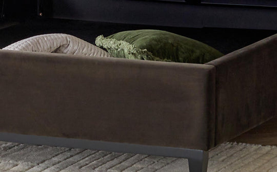The Monica king size ottoman storage bed combines sophisticated style with clever storage solutions. Upholstered in warm grey salt and pepper chenille fabric with contrasting dark mocha recycled velvet trim, this bed creates an elegant focal point whilst offering spacious hidden storage beneath. Dark wooden legs complete the refined design, perfect for contemporary bedrooms.