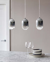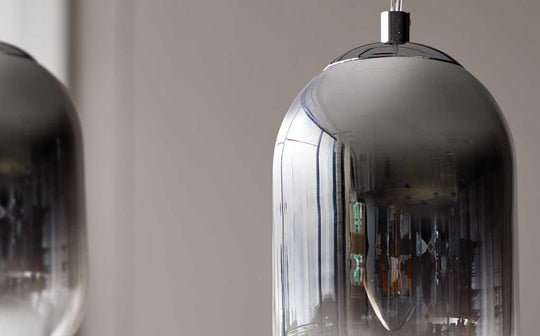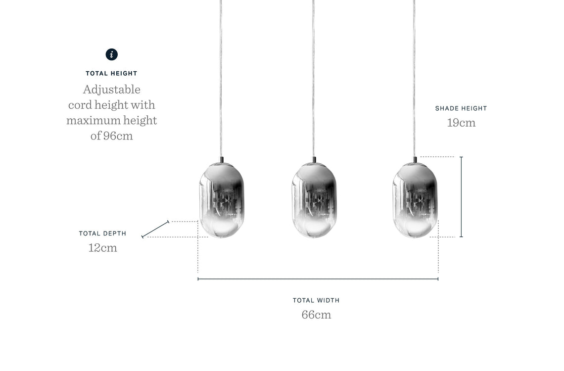 Transform your dining space with the Monroe chrome bar pendant, where industrial style meets refined sophistication. Three hand-blown glass shades in metallic grey ombre create beautifully diffused lighting that sets the perfect mood for dinner parties and morning coffee alike. Position above your kitchen island or dining table for instant impact.