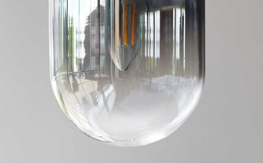 The Monroe single pendant adds a touch of modern, industrial-inspired style to any interior. Its sleek, chrome finish and rounded oblong shape create a striking silhouette, while the ombre, metallic grey hand-blown glass shade diffuses the light beautifully, creating a warm and inviting ambience. The clear flex cable complements the overall aesthetic, ensuring the focus remains on the beautiful glass detailing. Its adjustable cable length allows for versatile placement to suit various ceiling heights. Style the Monroe individually to create a subtle focal point or hang several together at varying heights above a dining table or kitchen island for a more dramatic effect. This pendant light complements a range of interior styles, from minimalist to contemporary, making it a perfect addition to dining rooms and kitchens alike.Details