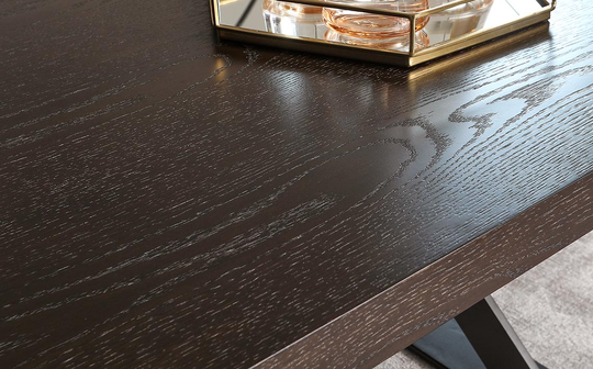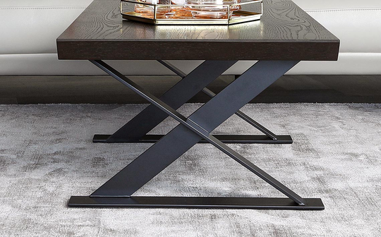 With its contemporary dark oak finish and chamfered edging, the Nala coffee table makes a stylish statement in any living room. The rectangular tabletop provides ample space for displaying books, decorative objects, or simply resting your cup of tea, while the sturdy, crossed-leg metal base adds a touch of industrial chic. This distinctive design detail elevates the Nala beyond the ordinary, creating a focal point for your living space. Style it with a large rug, a plush sofa, and coordinating side tables from the Nala collection for a cohesive look. The Nala coffee table is perfect for modern or industrial-inspired living rooms and open-plan spaces.Details