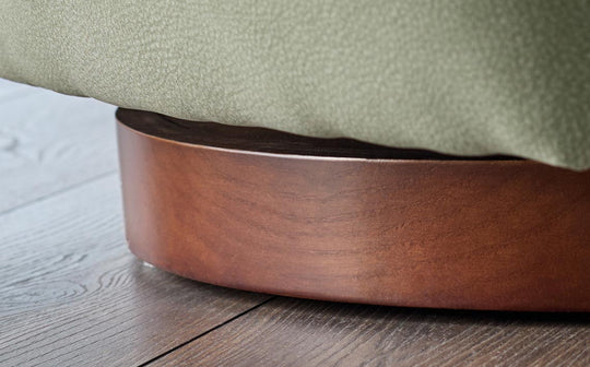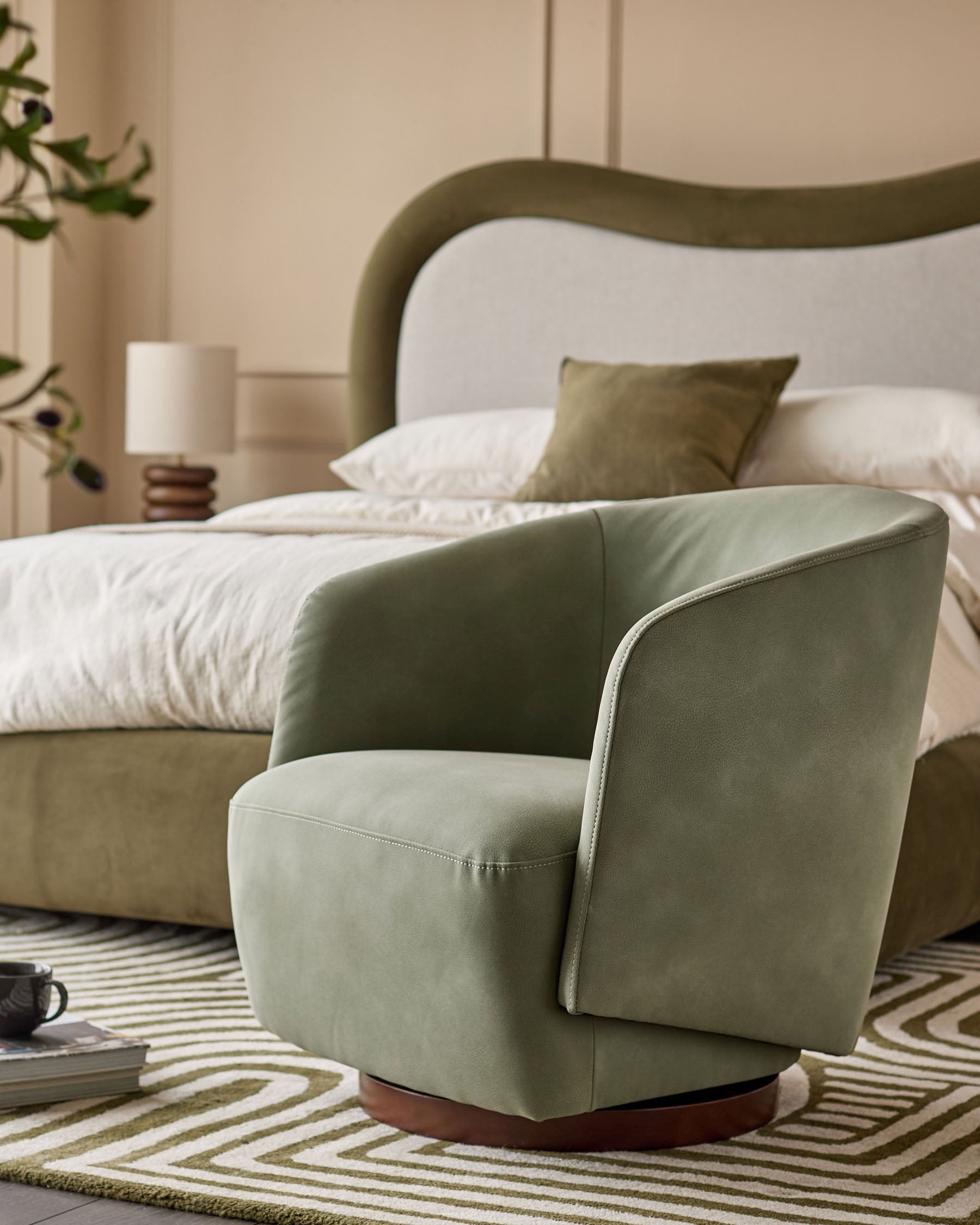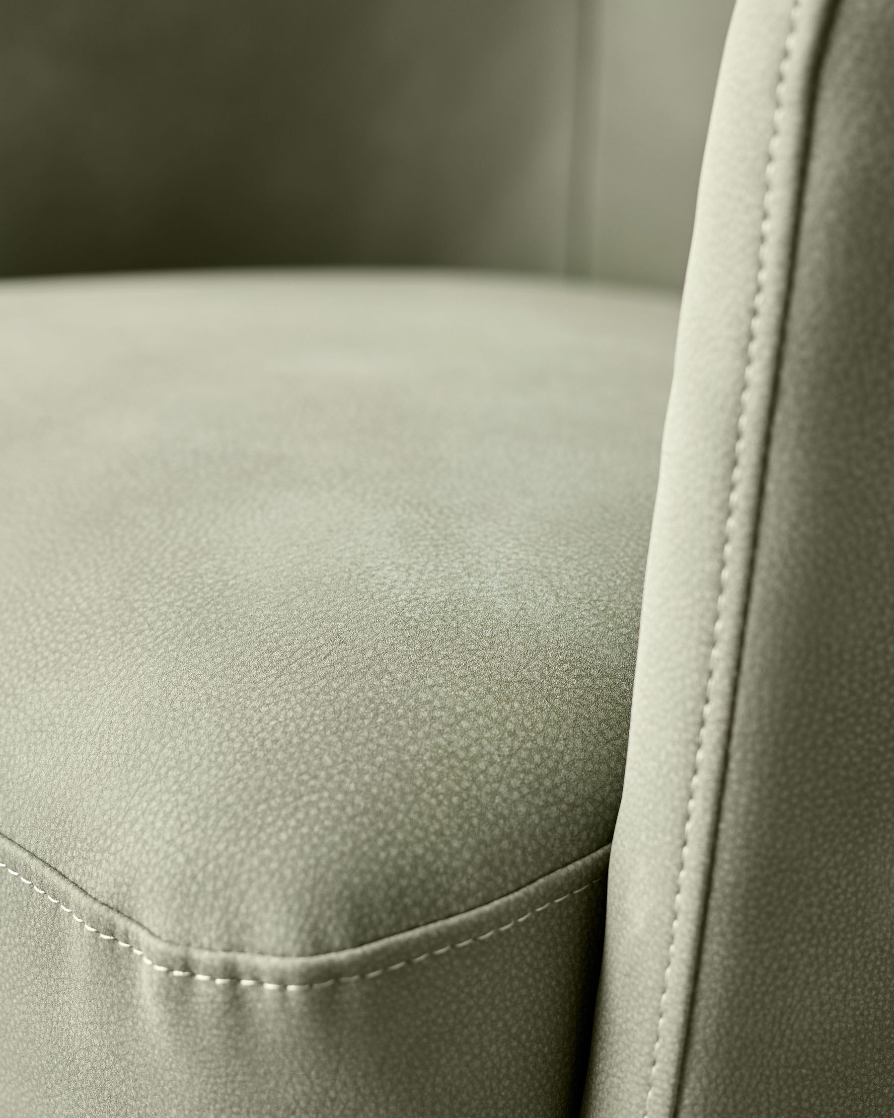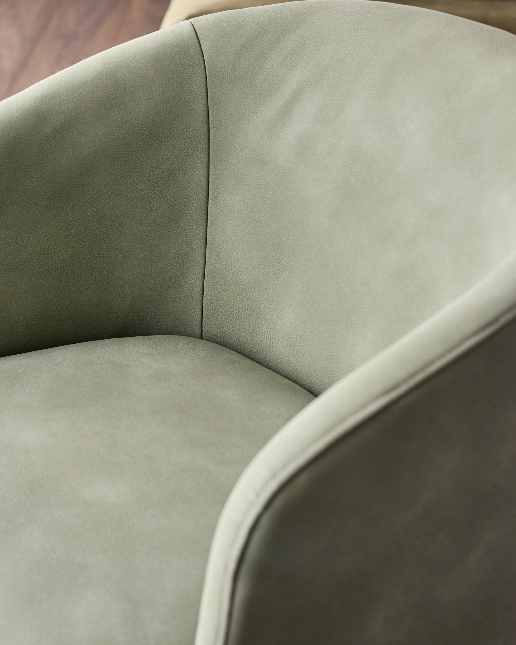 The Natalia sage green faux leather swivel accent chair brings contemporary comfort to any corner of your home. Upholstered in luxurious sage green Durosoft faux leather, this compact armchair features gently curved sides that create an inviting cocoon for reading or conversation. The smooth 360-degree swivel base lets you turn effortlessly to face any direction.