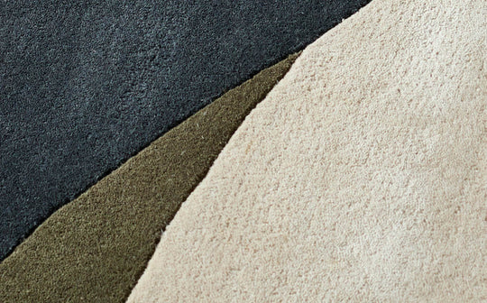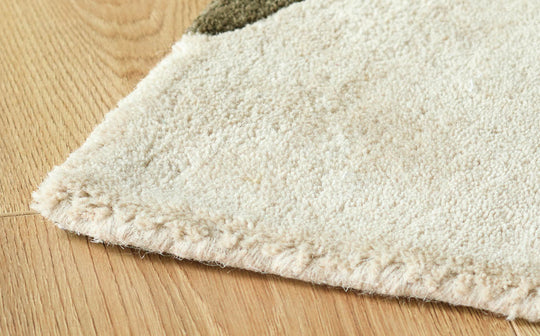 The Neo olive and navy textured large rug brings artistic sophistication to your floors with its contemporary design of overlapping organic shapes. Hand-tufted from luxurious 85% wool, this striking piece features earthy olive green, cream, beige and navy tones, accented by sculptural off-white loop arcs that add depth and texture to any living room, bedroom or dining space.