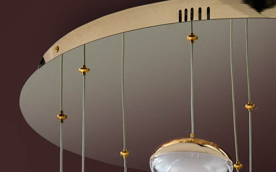 The Nina soft gold with clear glass LED adjustable 10 pendant creates a captivating focal point above your dining table or kitchen island. Ten oval-shaped shades, each with a warm soft gold top and translucent glass bottom, cast a gentle glow that sets the perfect mood for dinner parties and everyday meals. Individually adjustable drops let you create your own unique arrangement.