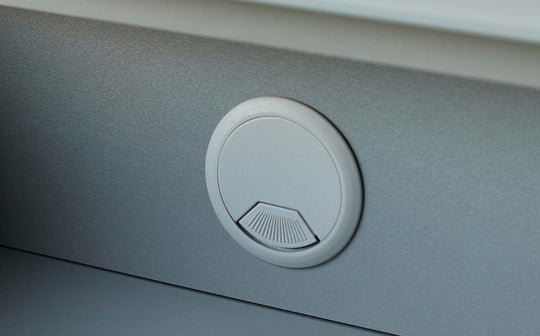 Close up of a grey desk featuring a circular cable tidy with a fan detail. Office or home working furniture.