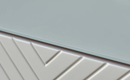 Close-up of modern white furniture with a subtle chevron pattern.