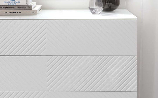 - Brilliant white gloss finish with chevron-style drawer fronts