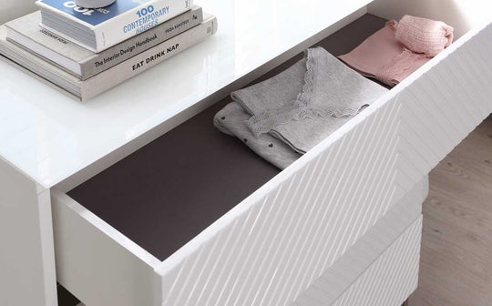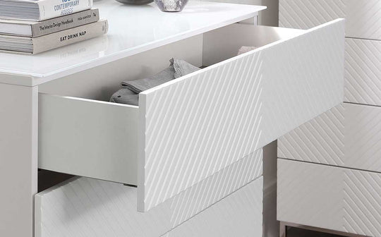 The Noah white gloss chest of drawers brings sophisticated storage to your bedroom with its striking chevron-style drawer fronts and luxurious high gloss finish. Five spacious drawers offer generous storage, while the push-to-open mechanism maintains clean lines. The velvet-lined top drawer adds an elegant touch for storing precious items, whilst the tempered glass top and stainless steel legs complete this contemporary piece.