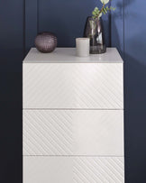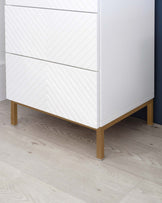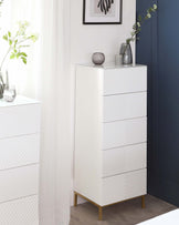 The Noah white gloss tallboy brings sleek storage to bedrooms where space is precious. Its tall, narrow profile maximises vertical space while the crisp white gloss finish and brass legs create a striking contemporary look. Five push-to-open drawers offer generous storage, with the top drawer velvet-lined for treasured items.