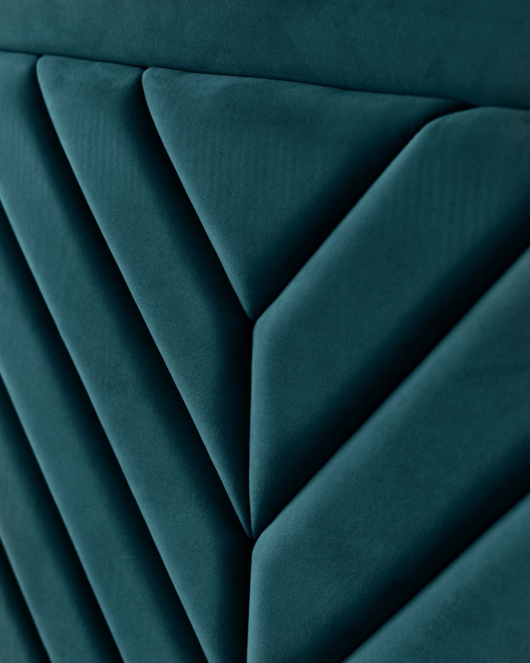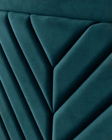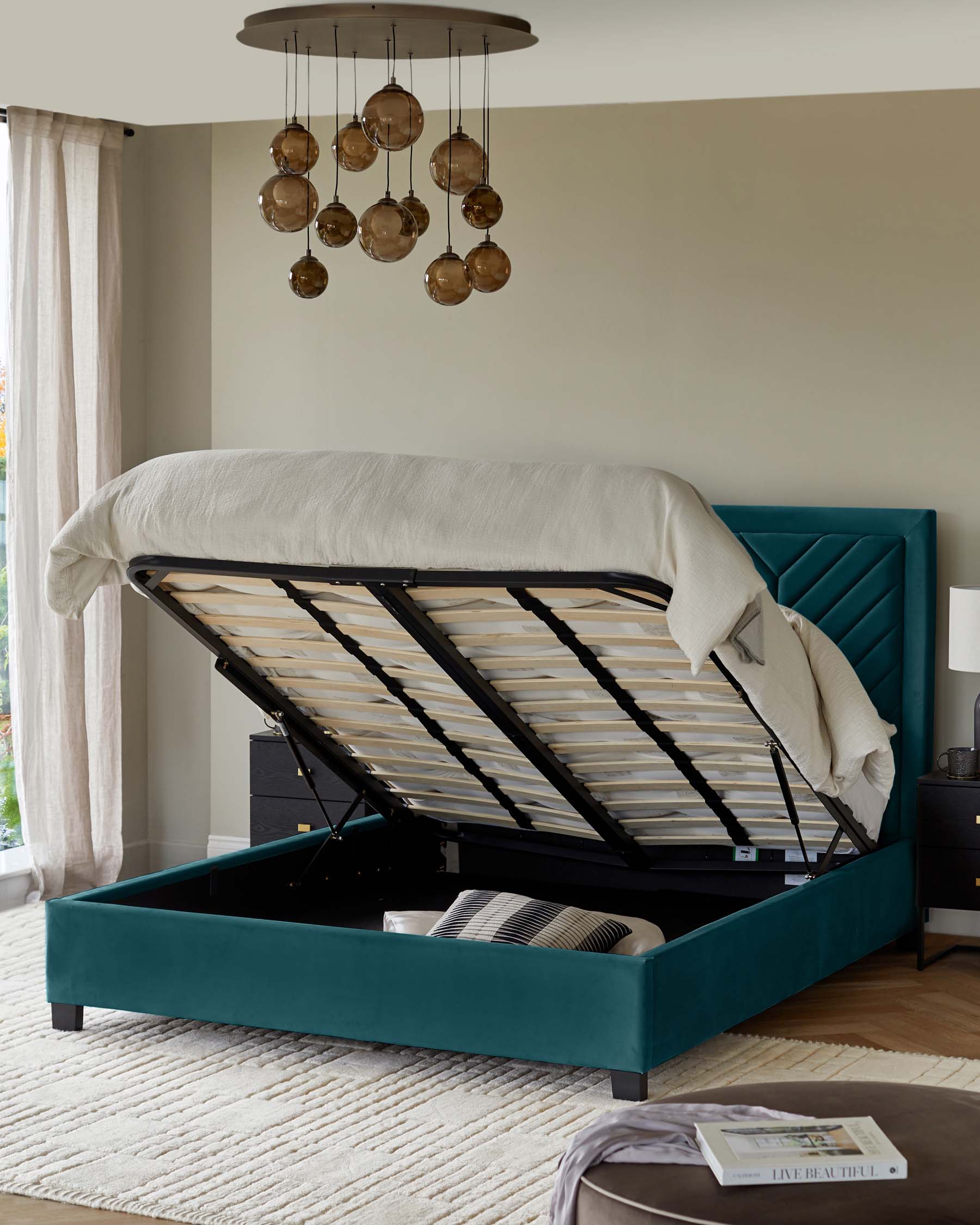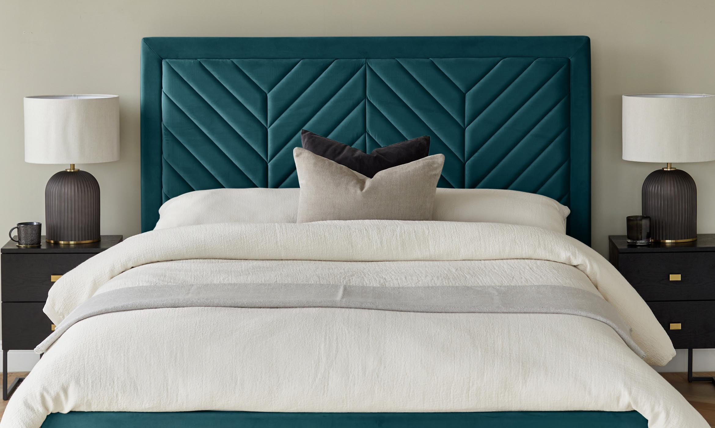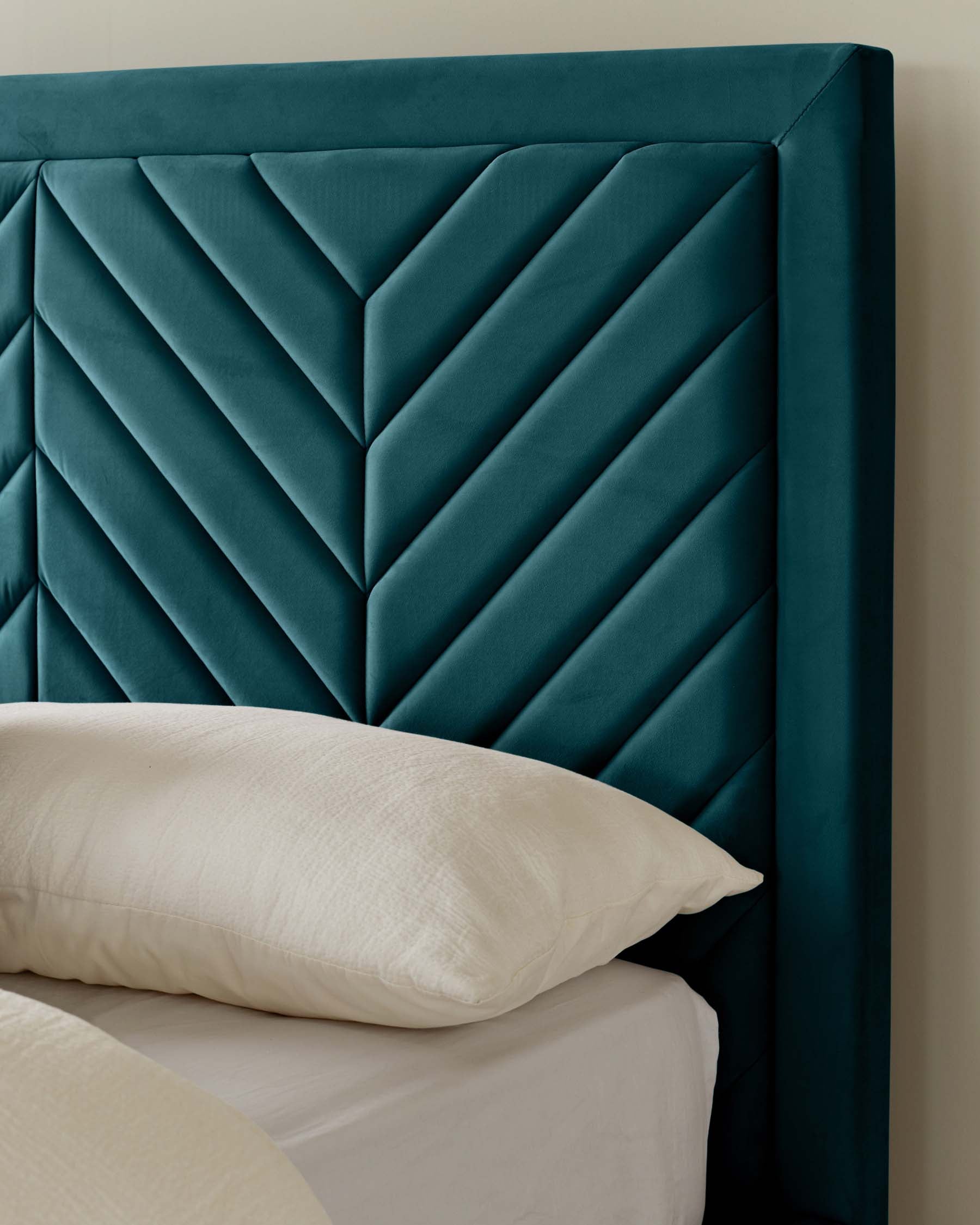 The Octavia velvet bed frame is a stylish and modern addition to any bedroom. The contemporary, chevron-patterned headboard creates a striking focal point, while the sleek minimalist base complements the overall design. Upholstered in a luxurious dark teal velvet, this king-size bed offers a soft and inviting feel. The spacious ottoman storage, accessed via a smooth-lifting mechanism with durable hydraulic pistons, provides a practical solution for storing extra bedding, pillows, or blankets. The sprung slats and webbing offer superior support and comfort for a restful night's sleep. Style the Octavia with crisp white bedding, patterned throws, and scatter cushions in complementary colours to enhance the rich teal tones. Complete the look with one of our bedside tables and contemporary bedside lamps.Details