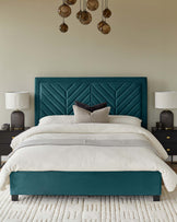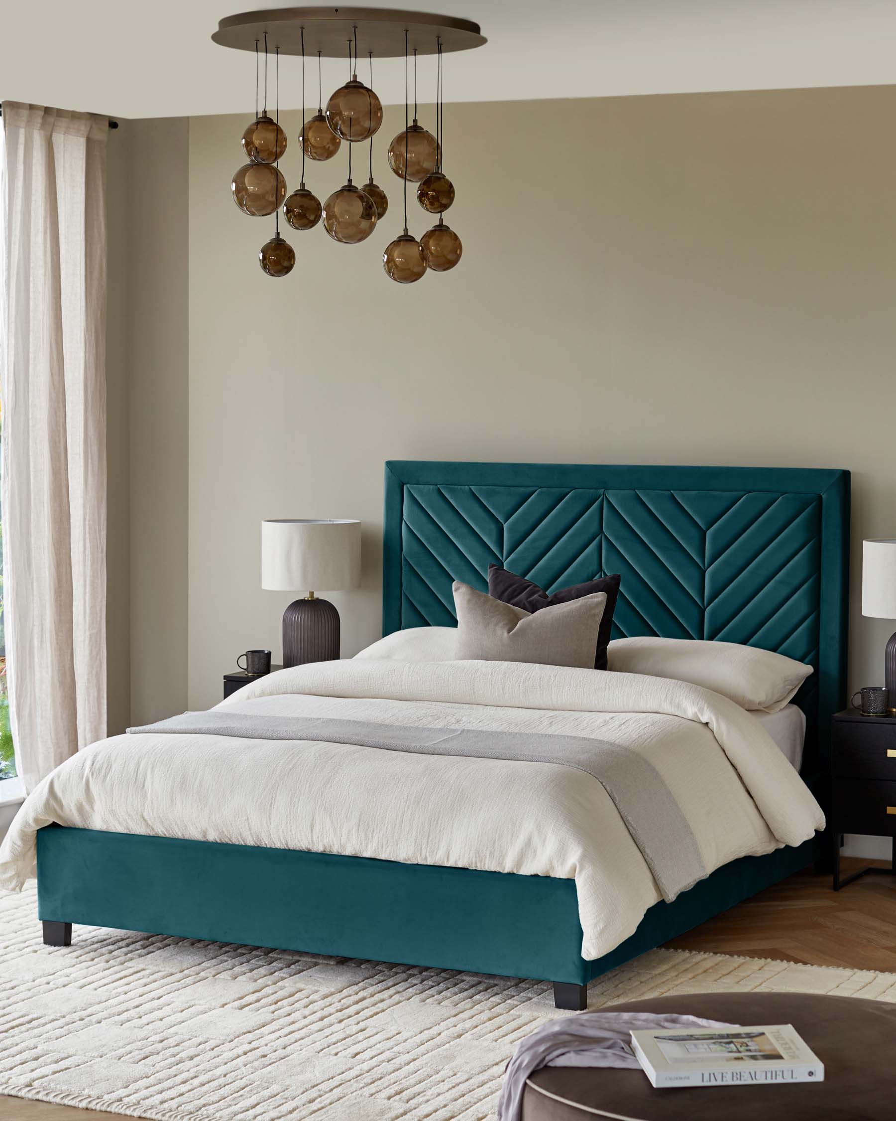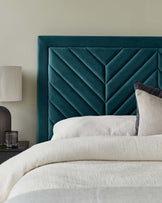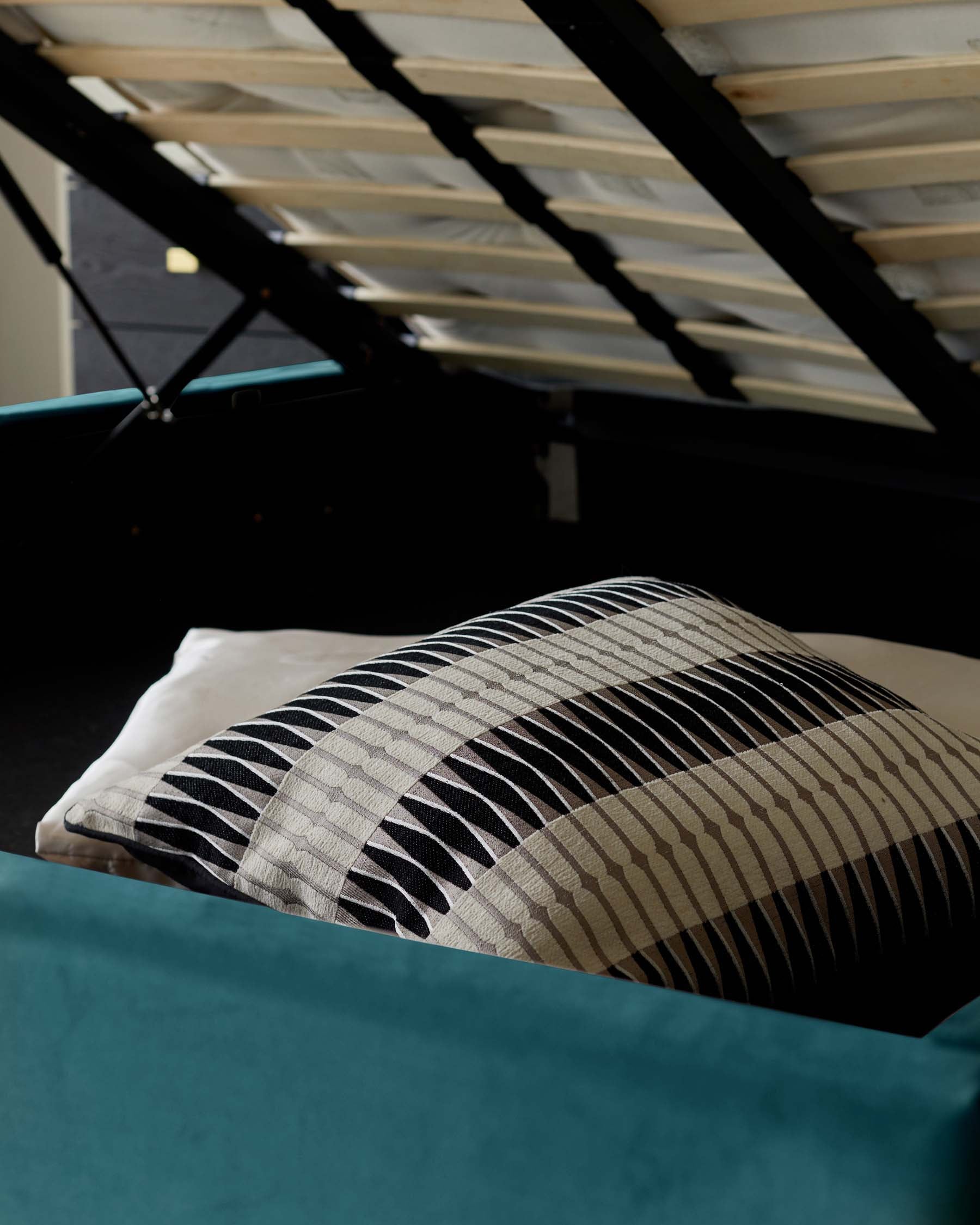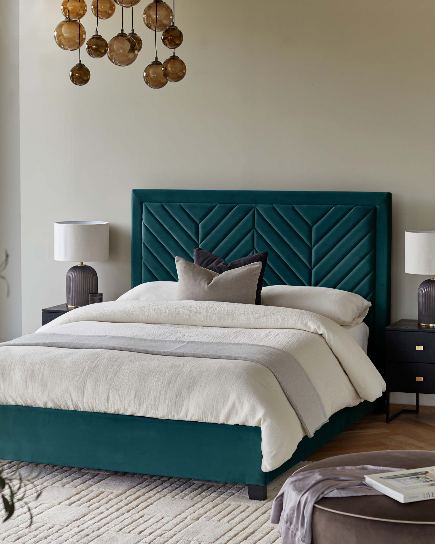 The Octavia velvet bed frame is a stylish and modern addition to any bedroom. The contemporary, chevron-patterned headboard creates a striking focal point, while the sleek minimalist base complements the overall design. Upholstered in a luxurious dark teal velvet, this king-size bed offers a soft and inviting feel. The spacious ottoman storage, accessed via a smooth-lifting mechanism with durable hydraulic pistons, provides a practical solution for storing extra bedding, pillows, or blankets. The sprung slats and webbing offer superior support and comfort for a restful night's sleep. Style the Octavia with crisp white bedding, patterned throws, and scatter cushions in complementary colours to enhance the rich teal tones. Complete the look with one of our bedside tables and contemporary bedside lamps.Details
