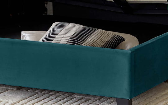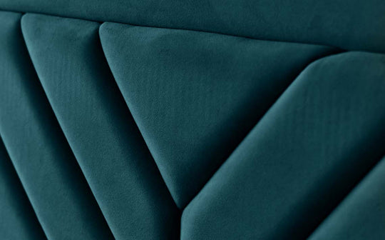 The Octavia velvet bed frame is a stylish and modern addition to any bedroom. The contemporary, chevron-patterned headboard creates a striking focal point, while the sleek minimalist base complements the overall design. Upholstered in a luxurious dark teal velvet, this king-size bed offers a soft and inviting feel. The spacious ottoman storage, accessed via a smooth-lifting mechanism with durable hydraulic pistons, provides a practical solution for storing extra bedding, pillows, or blankets. The sprung slats and webbing offer superior support and comfort for a restful night's sleep. Style the Octavia with crisp white bedding, patterned throws, and scatter cushions in complementary colours to enhance the rich teal tones. Complete the look with one of our bedside tables and contemporary bedside lamps.Details