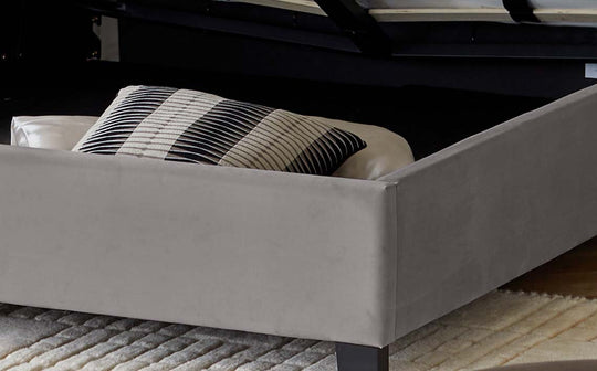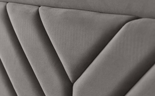 The Octavia grey velvet super king size ottoman storage bed is a stylish and modern addition to any bedroom. Upholstered in a luxuriously soft, matt velvet, this bed combines comfort with practicality. The spacious ottoman storage, accessed via a smooth-lifting hydraulic mechanism, is perfect for keeping bedding and other items tucked away. Durable sprung slats provide enhanced comfort and support for a restful night's sleep. The striking, chevron-patterned headboard adds a touch of contemporary elegance, making this bed a true statement piece. Style the Octavia bed with crisp white bedding, plush throws, and a selection of scatter cushions for a luxurious and inviting feel. Complete the look with matching bedside tables and a coordinating mattress for a cohesive bedroom scheme.Details