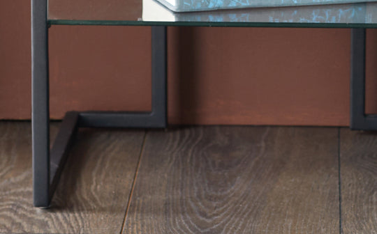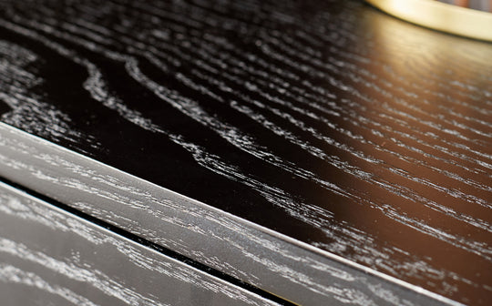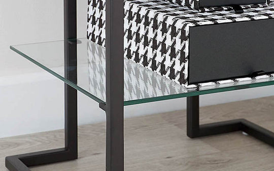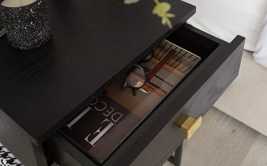 The Odele black ash bedside table brings sophisticated storage to your bedroom with its striking combination of rich black ash veneer and brushed brass legs. This exclusively designed piece features a soft-close drawer for quiet nighttime access and a clear tempered glass shelf that adds visual lightness while providing practical storage for books or decorative touches.