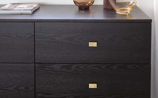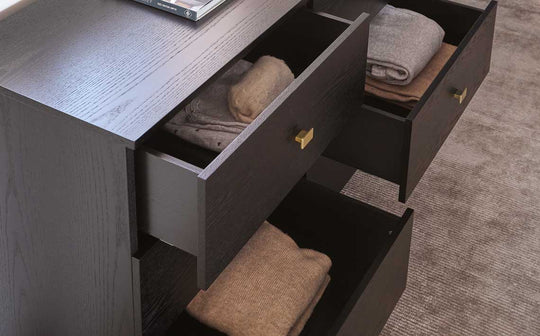 The Odele black ash chest of drawers brings sophisticated storage to your bedroom or living space. With its striking black ash finish and contemporary brass handles, this 6-drawer chest offers generous storage while maintaining a sleek profile. Perfect for organising clothes, linens or everyday essentials, each spacious drawer glides smoothly on soft-close runners for that premium feel.