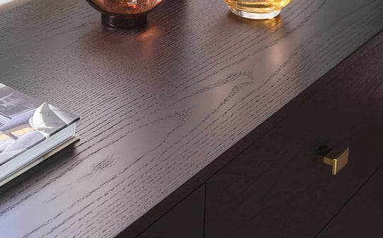 A contemporary, dark-wood sideboard with a textured finish and elegant brass handles on its drawers.