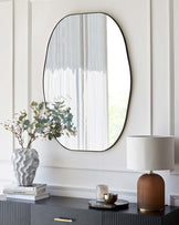 Transform your space with the Odense large wall mirror - a thoughtfully designed piece that brings light and depth to any room. Its softly rounded oblong shape and slim black frame create a contemporary focal point that works beautifully above a console table, in your hallway, or as a statement piece in the bedroom. Hang it horizontally or vertically to suit your space perfectly.