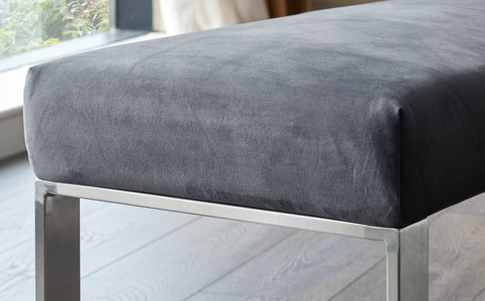 Create a sophisticated dining space with the Ophelia 3 seater bench. Upholstered in sumptuous dark grey velvet and supported by sleek stainless steel legs, this backless bench brings contemporary elegance to mealtimes. Perfect alongside a pedestal table or as stylish extra seating in your hallway, its minimalist design fits beautifully wherever gatherings happen.