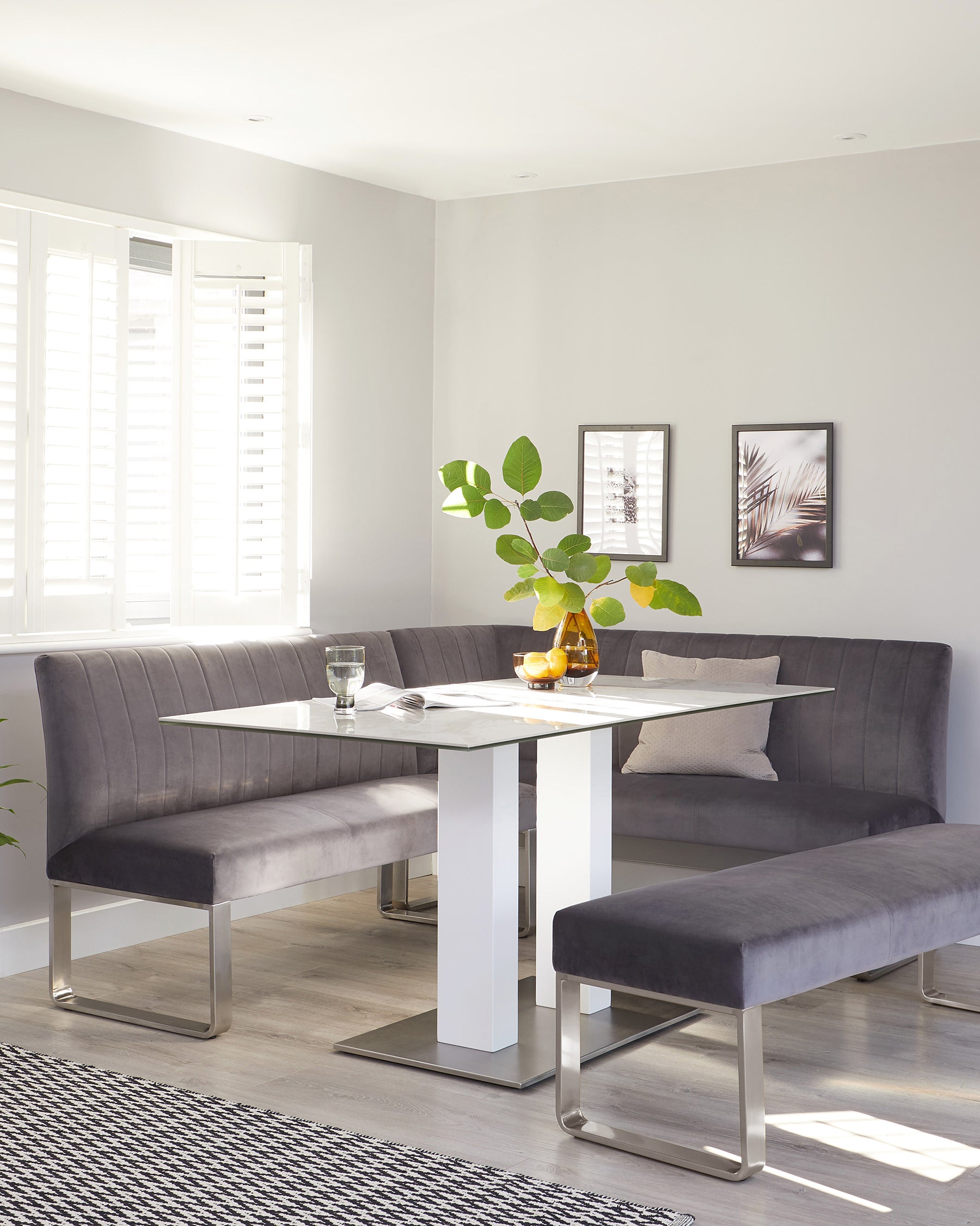 Create a sophisticated dining space where conversations flow as smoothly as the wine. The Ophelia corner bench brings luxurious comfort to your dining area with its plush dark grey velvet upholstery and generous 5-seater design. Perfect for kitchen corners or open-plan spaces, this left-hand configuration maximises seating while maintaining an elegant profile with sleek stainless-steel legs.