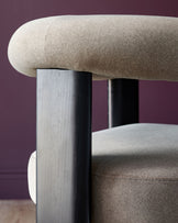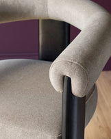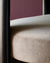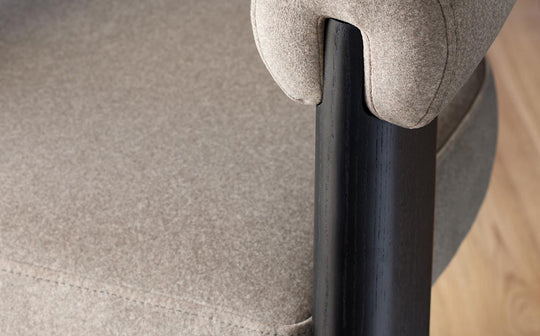 The Orion mocha fabric dining chair brings sculptural style to your dining space with its distinctive tripod frame and dark wood legs. Upholstered in rich mocha smooth woven fabric, this chair features integrated bolster-style armrests that flow seamlessly into the angled backrest. The thickly cushioned seat ensures comfort through everyday meals and long dinner parties alike.