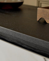 Thoughtfully designed with a seamless natural ceramic front and striking black wood frame, the Orlan sideboard brings sophisticated storage to your dining room or living space. Its curved sides and rounded edges create an organic flow, while three push-to-open doors reveal adjustable shelving that adapts to your needs. A statement piece that's built for real life.
