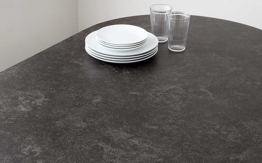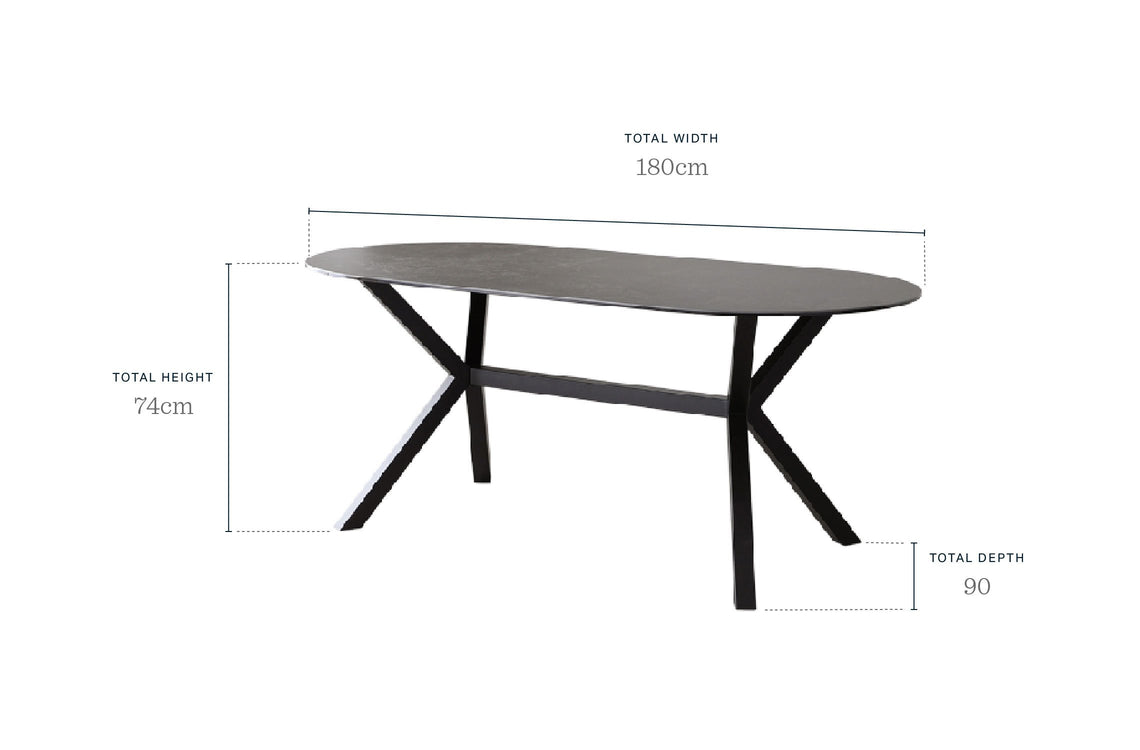 The Orwell dining table is a dream for family dinners, thanks to its spacious oval design, softened curved edges, and durable dark grey ceramic top. This low-maintenance ceramic surface is both scratch and heat-resistant - perfect for busy family life. The striking, modern take on a trestle leg base in a sleek metal finish adds a real point of interest. This versatile piece works beautifully in a range of interiors, from open-plan kitchens to more formal dining areas. Style it with contemporary upholstered dining chairs for a touch of elegance, or opt for minimalist benches for a relaxed, modern feel. Complete the look with a statement pendant light to create a warm and inviting dining space.Details