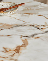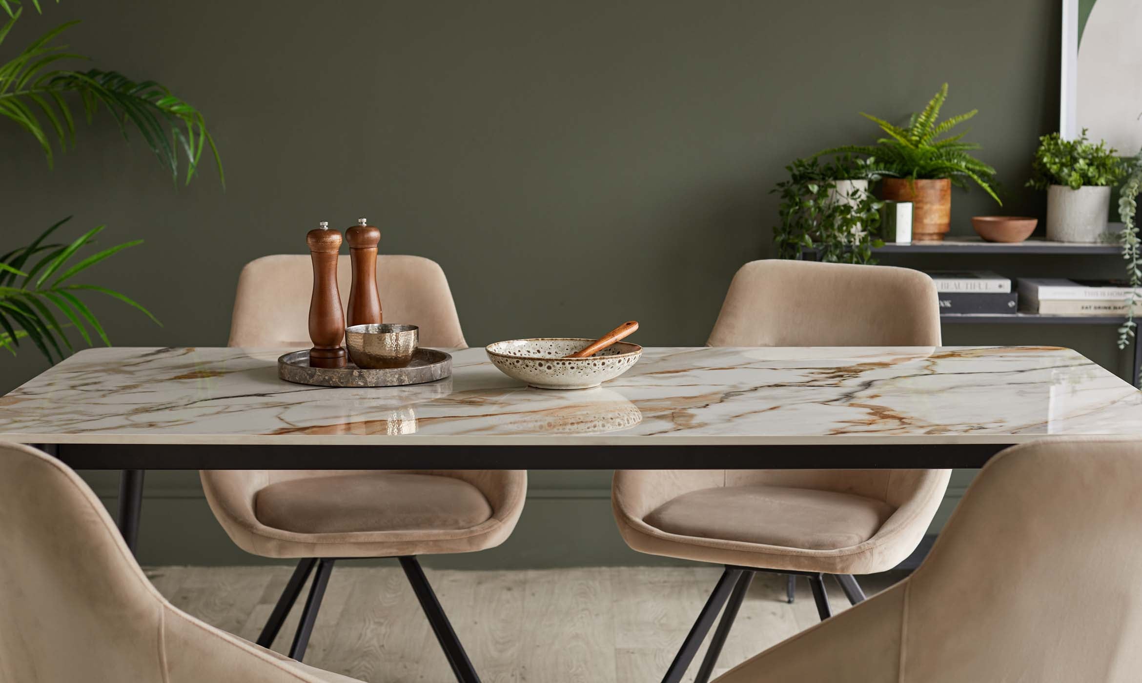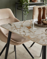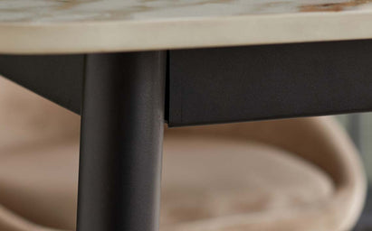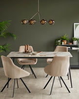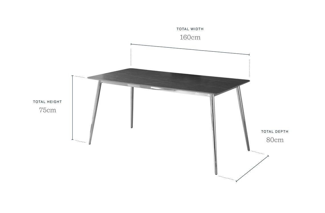 The Oslo natural ceramic 6 seater dining table combines Nordic simplicity with practical luxury. Its glossy ceramic top delivers the beauty of marble with heat-resistant durability that handles hot dishes straight from the oven. The sleek black metal frame and tapered legs create a modern silhouette that works beautifully in contemporary dining rooms and open-plan kitchens.