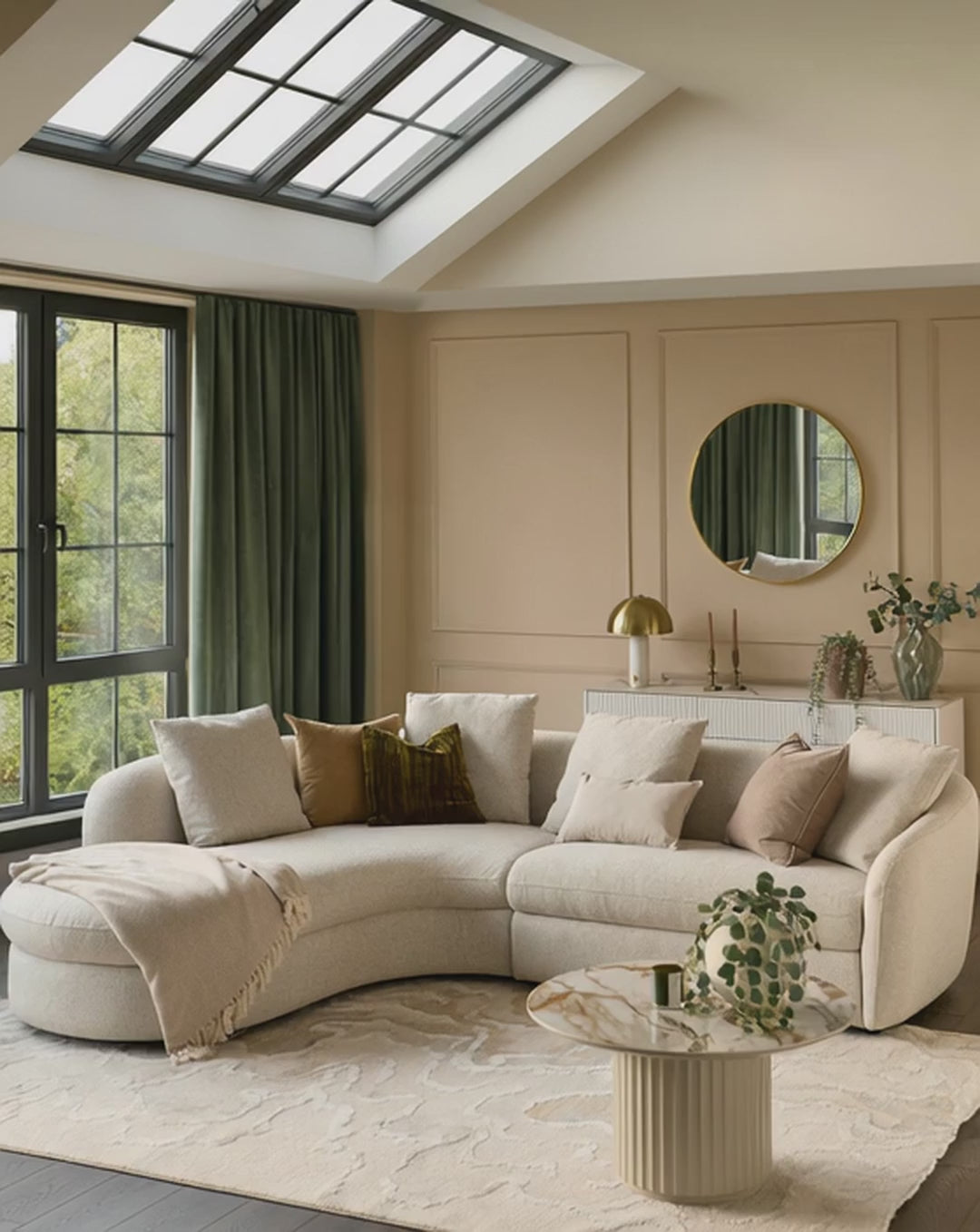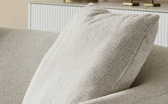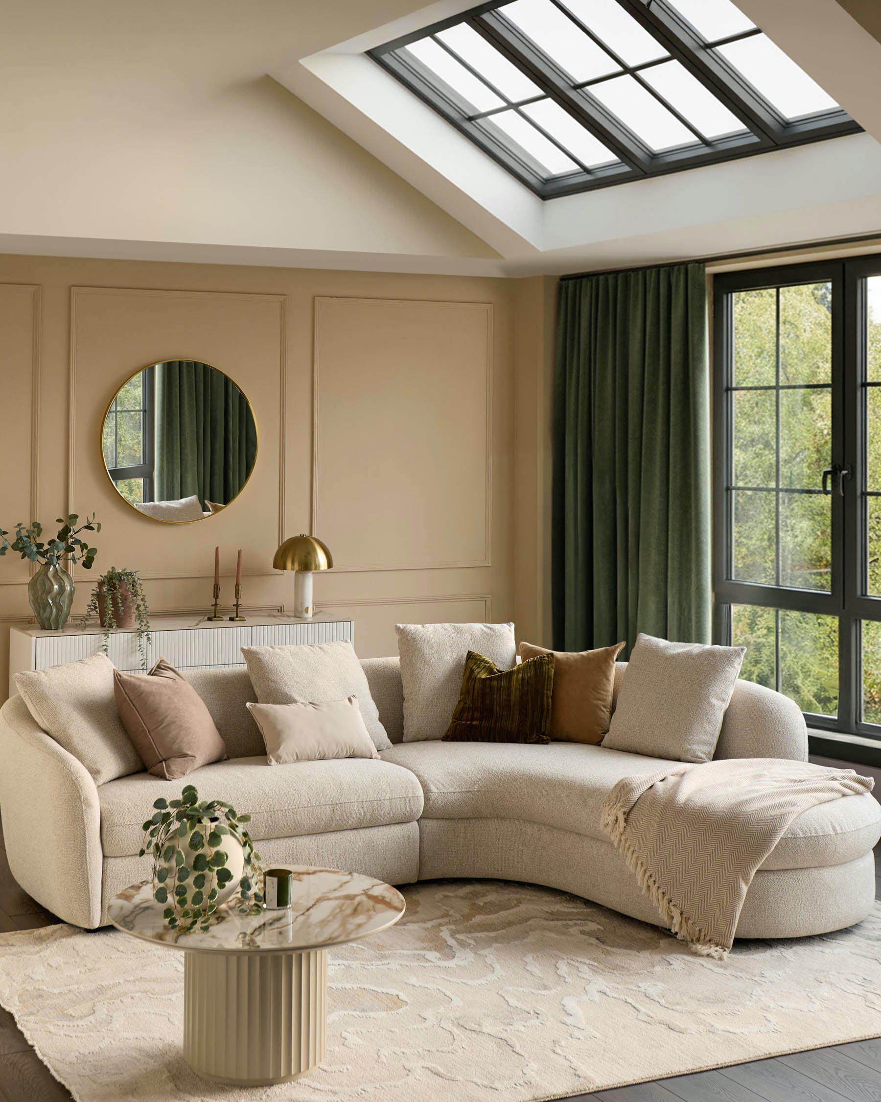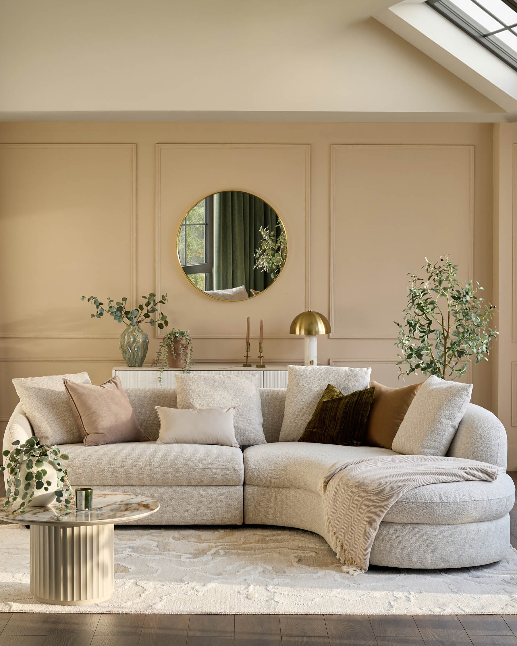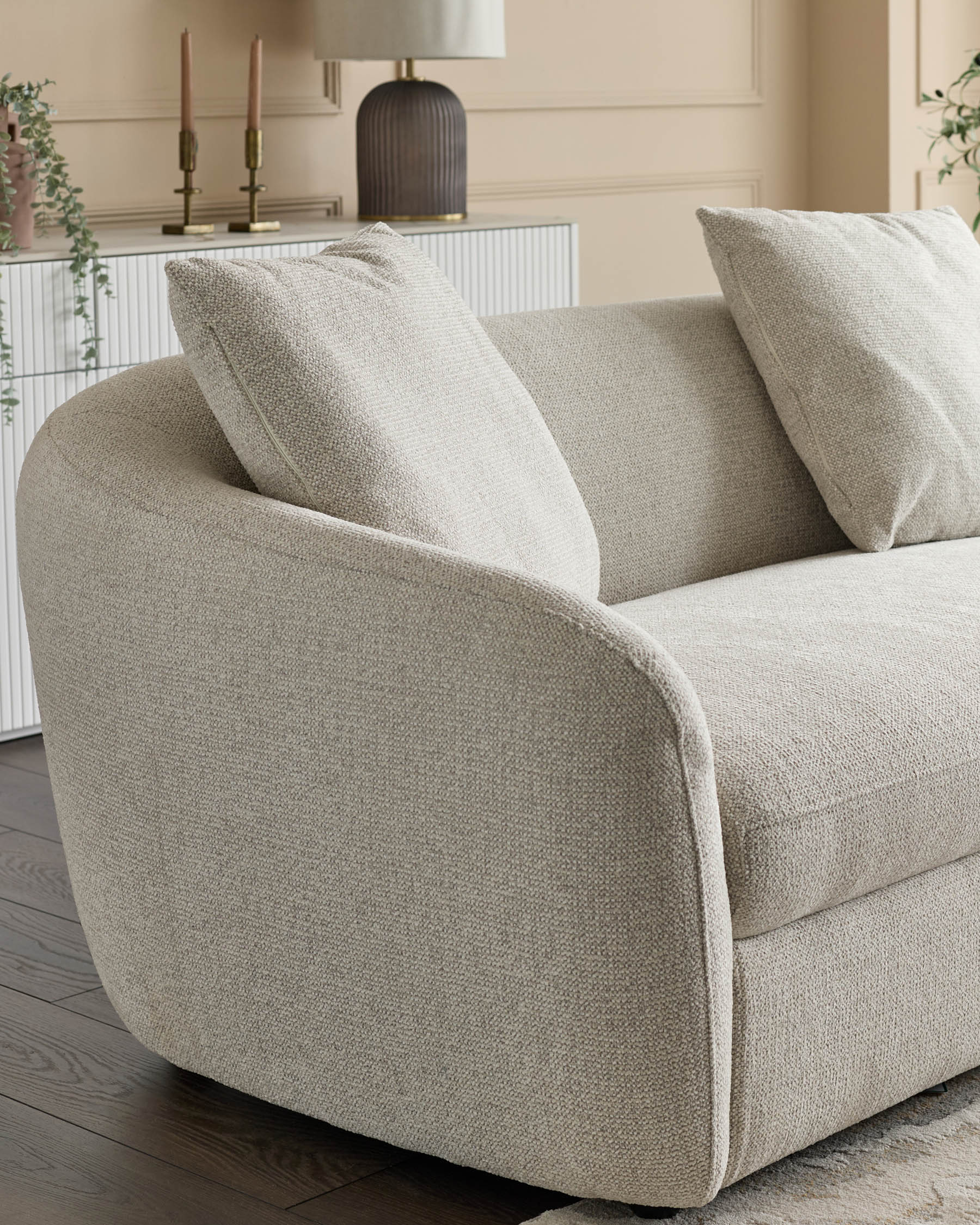 Effortlessly sophisticated, the Ottilie natural fabric right hand corner chaise sofa brings cloud-like comfort to your living space. Its distinctive rounded design and graceful curves create an inviting silhouette perfect for gatherings that stretch into the evening. Upholstered in luxurious natural-toned chunky chenille, this 4-seater corner sofa combines tactile richness with family-friendly durability.