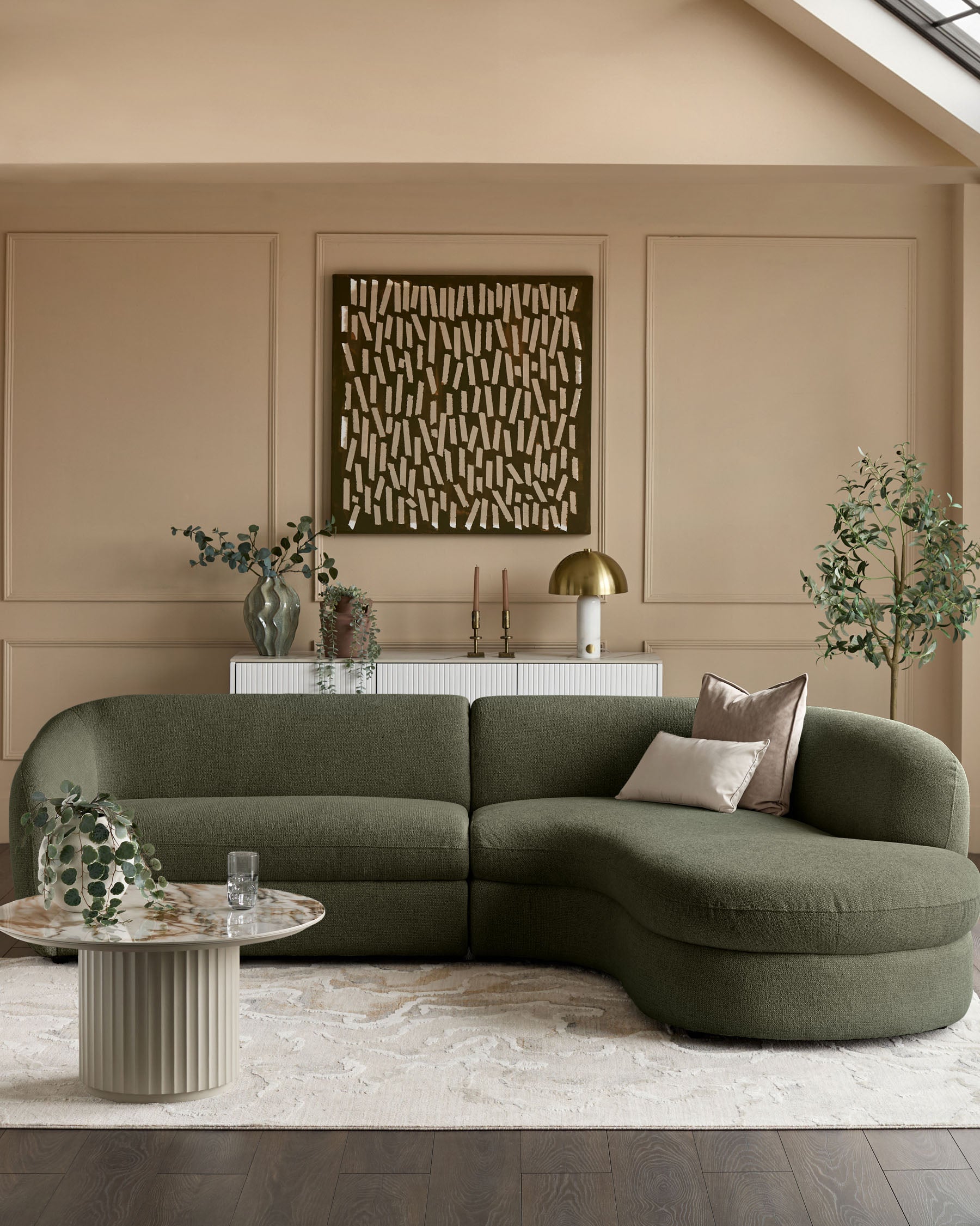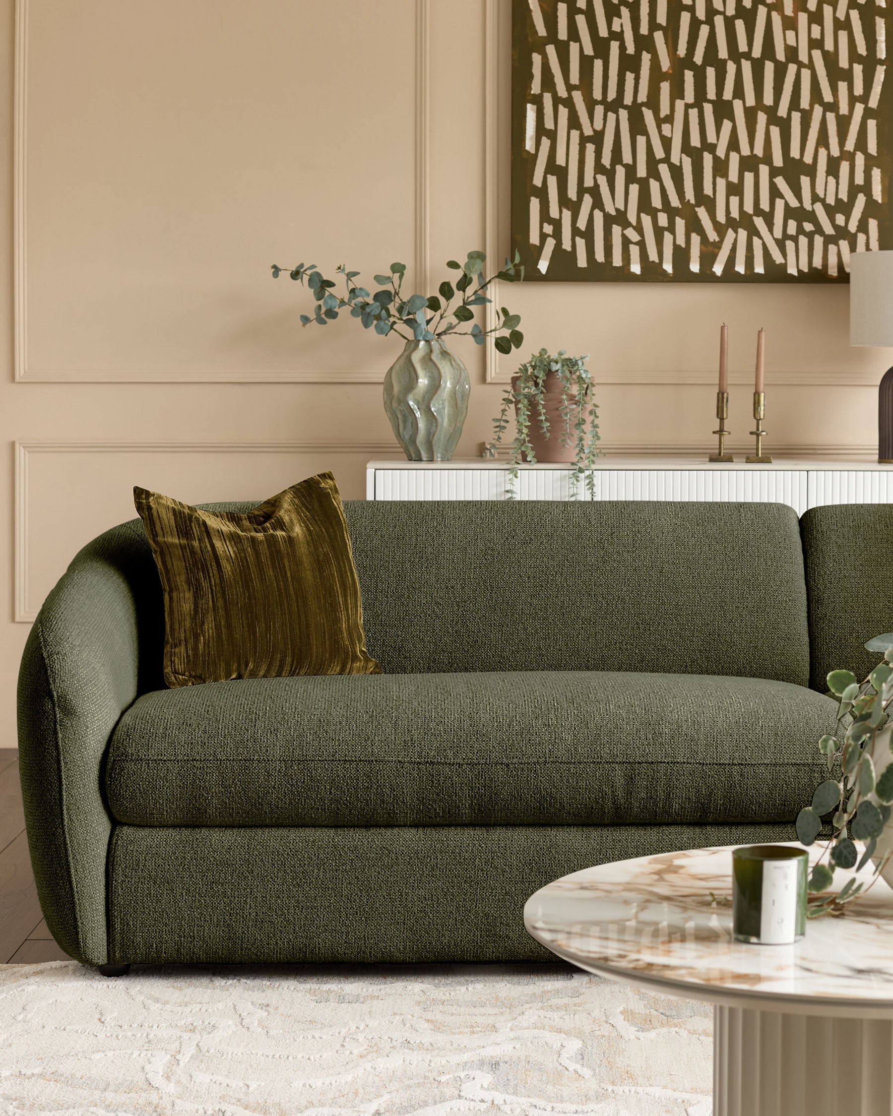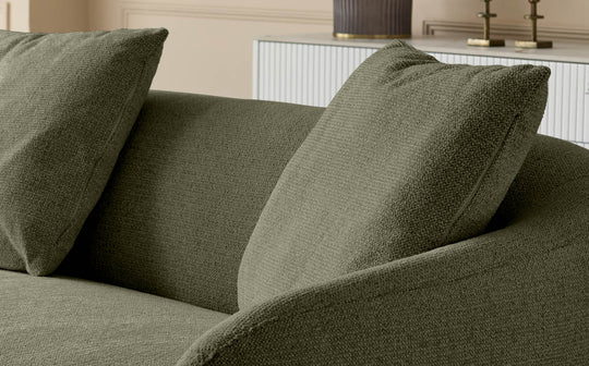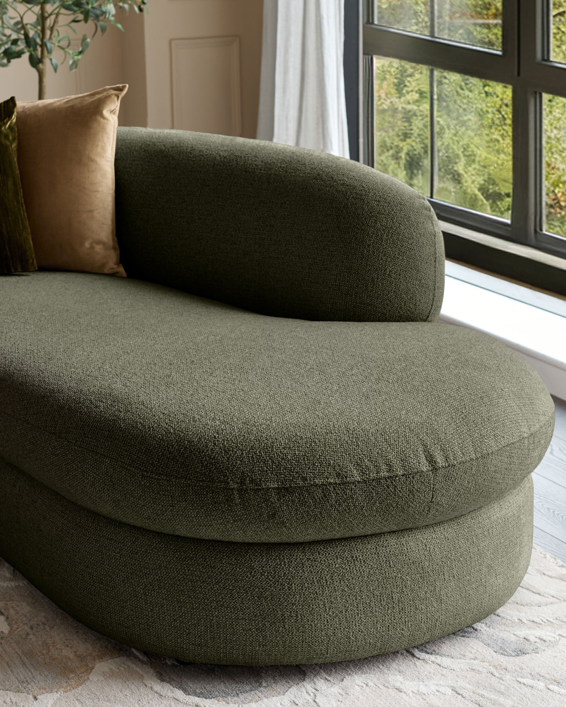 In plush Olive Green chenille, the right-hand Ottilie sofa introduces a beautiful balance of depth, softness and sculptural shape. Its flowing right-hand curve opens the room, guiding movement and creating an effortless sense of calm. Selected in our studio with intention behind every detail, Ottilie brings together spacious lounging, enveloping comfort and a modern, crafted aesthetic. The plush chenille upholstery is irresistibly tactile yet durable enough for real-life moments from everyday relaxation to weekend gatherings. With its independent character and thoughtful proportions, Ottilie transforms your living space into somewhere you instinctively settle. Built to last and made to live with, it's a piece where function meets beauty, ready to elevate every moment that unfolds around it.