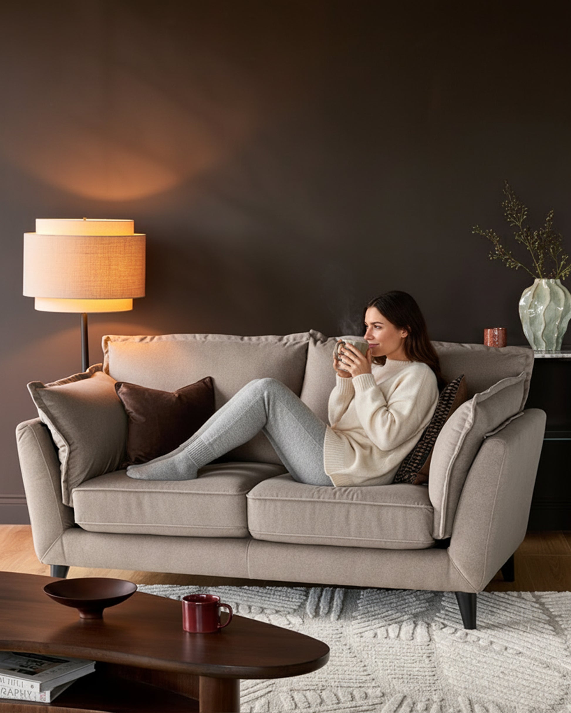 - Soft curves and warm neutral tones