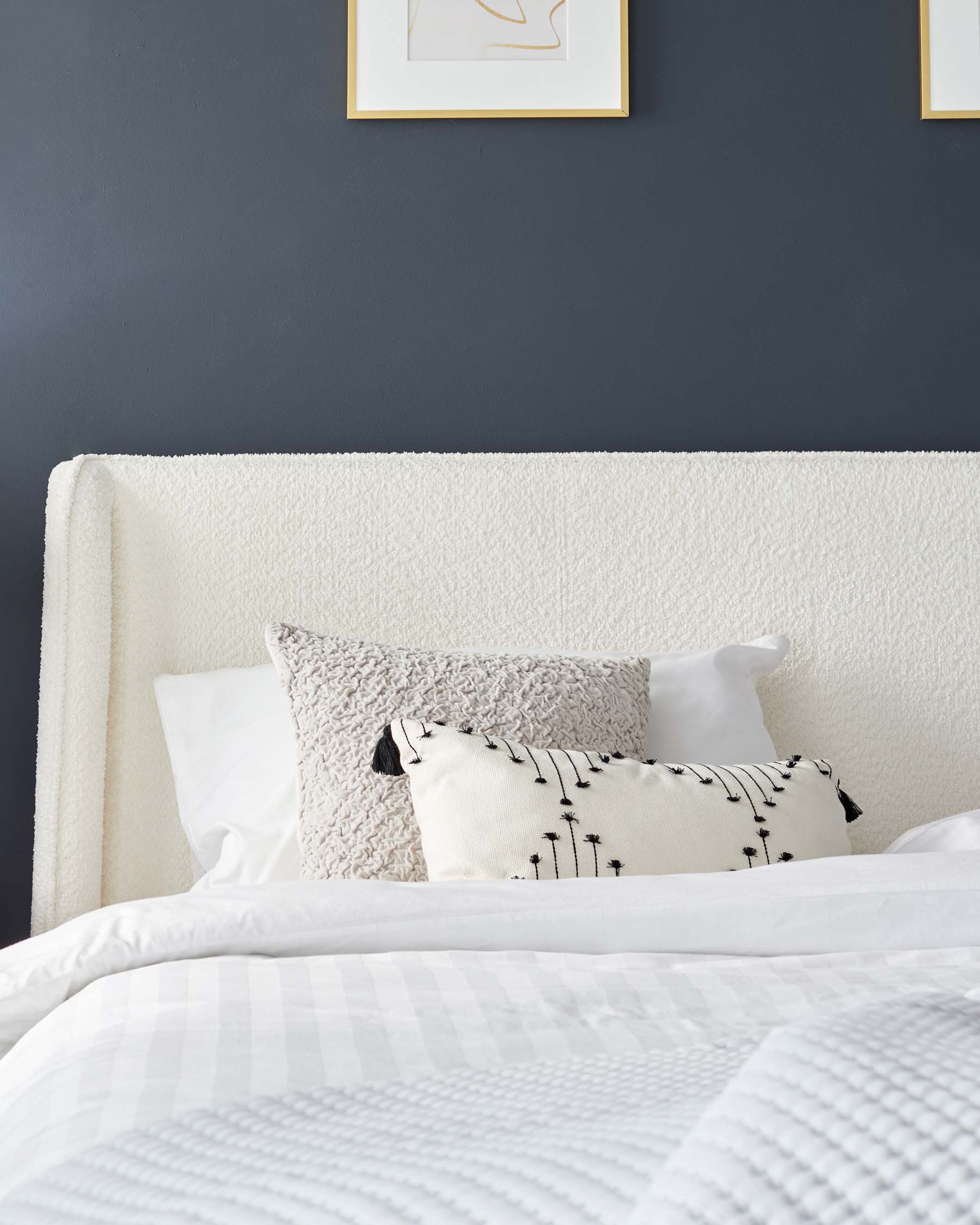 A boucle headboard on a bed with decorative pillows and a navy side table. Stylish and modern bedroom furniture.