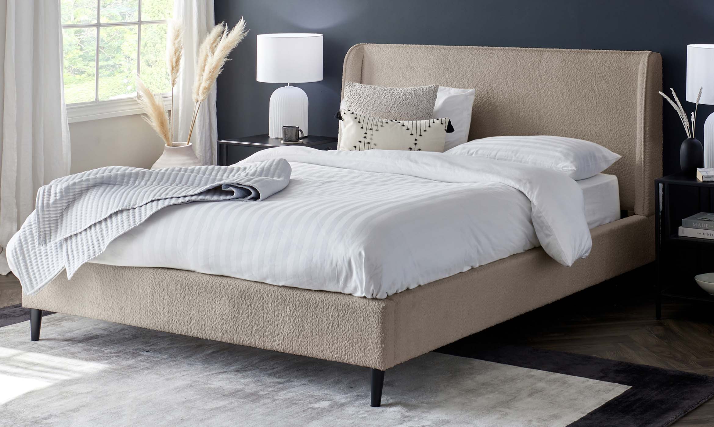 Thoughtfully designed for those who value comfort without compromise, the Paolo Natural Soft Boucle king bed transforms your bedroom into a sanctuary. Its luxuriously upholstered headboard, wrapped in soft boucle fabric, creates the perfect backrest for Sunday morning coffee or late-night reading. The subtle winged design and calming cream tone bring sophisticated warmth to any space.