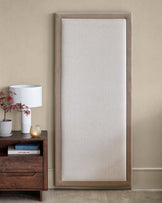 A sleek upholstered wall panel in light fabric with a soft beige frame, paired with a modern side table and decorative lamp.