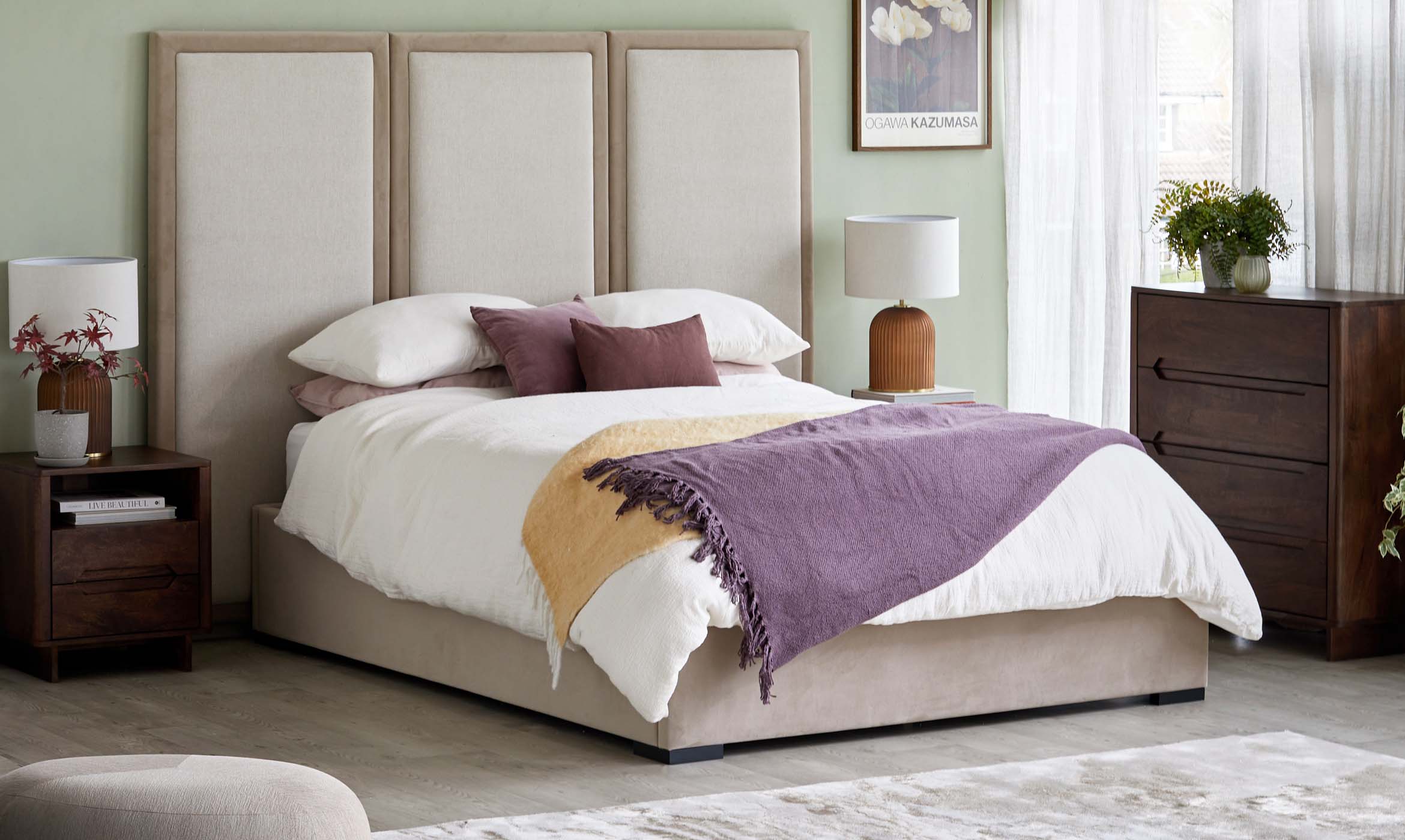 Elegant upholstered bed with soft headboard, layered pillows, a cozy blanket, and a stylish bedside lamp on a wooden nightstand.