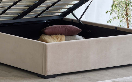 Transform your bedroom into a luxurious retreat with the Penelope champagne recycled velvet king size ottoman bed. Its striking 5-panel headboard creates instant impact, while the ottoman base offers generous hidden storage for bedding and seasonal items. Upholstered in soft, sustainable recycled velvet with a sophisticated champagne finish, this bed combines style with practical living.